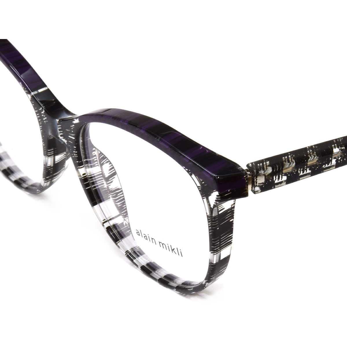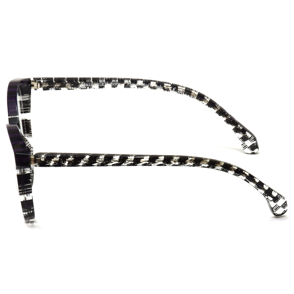 フレーム全体で黒とクリアの市松模様を大胆に表現し、ポイントカラーにはパープルを採用。掛けるだけでいつものスタイリングを格上げしてくれるアーティスティックなアイウェアです。