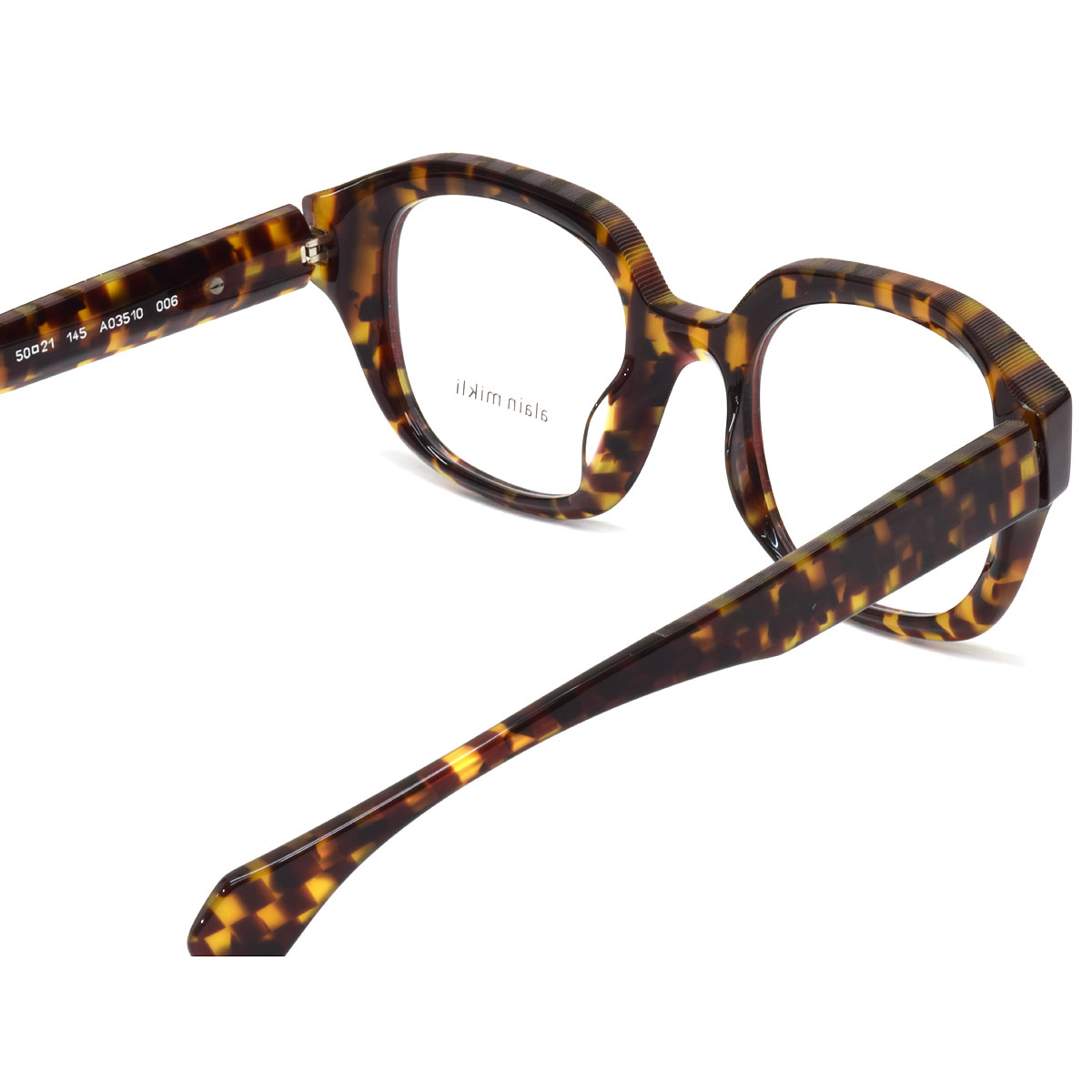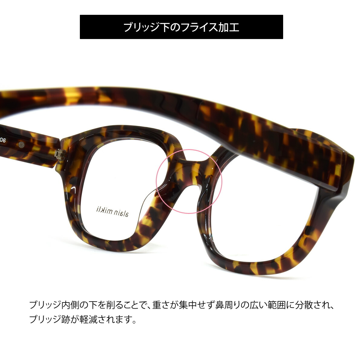 快適さを向上させて鼻に跡が付くのを軽減するためブリッジ下にミリング(削り)を施し、蝶番にはテンプルが外側にも少し広げられる、改良されたAM Flex(アムフレックス)ヒンジを採用していますので、耳上に心地よくフィットしてくれます。90°形状の新しいバイオリサイクルアセテートテンプルチップは、フレームを置いた時に机に水平に設置できますので掛け具合の微調整の精度が増すとともに、掛けた時の負荷を均等に分散して、装用感を向上させてくれます。-新生alain mikli-1978年にフランスのデザイナーであるアラン・ミクリによって設立され「見るための、そして見られるためのメガネ」、「機能性と審美性」をコンセプトに、斬新でアートのようなデザインと高品質な素材を組み合わせたアイウェアを展開してきた、世界的に有名なメガネブランド“alain mikli”。