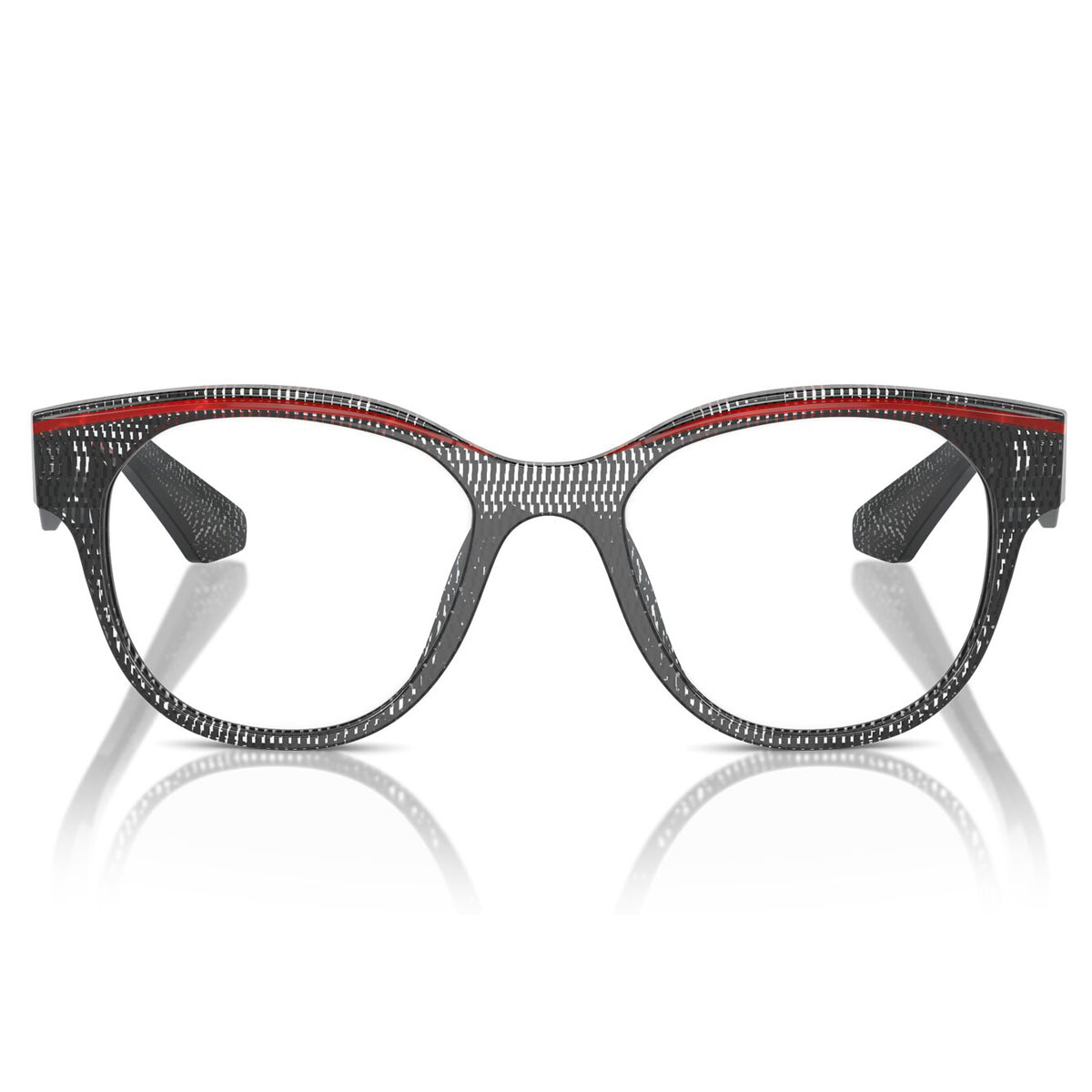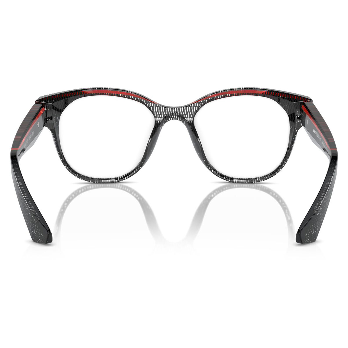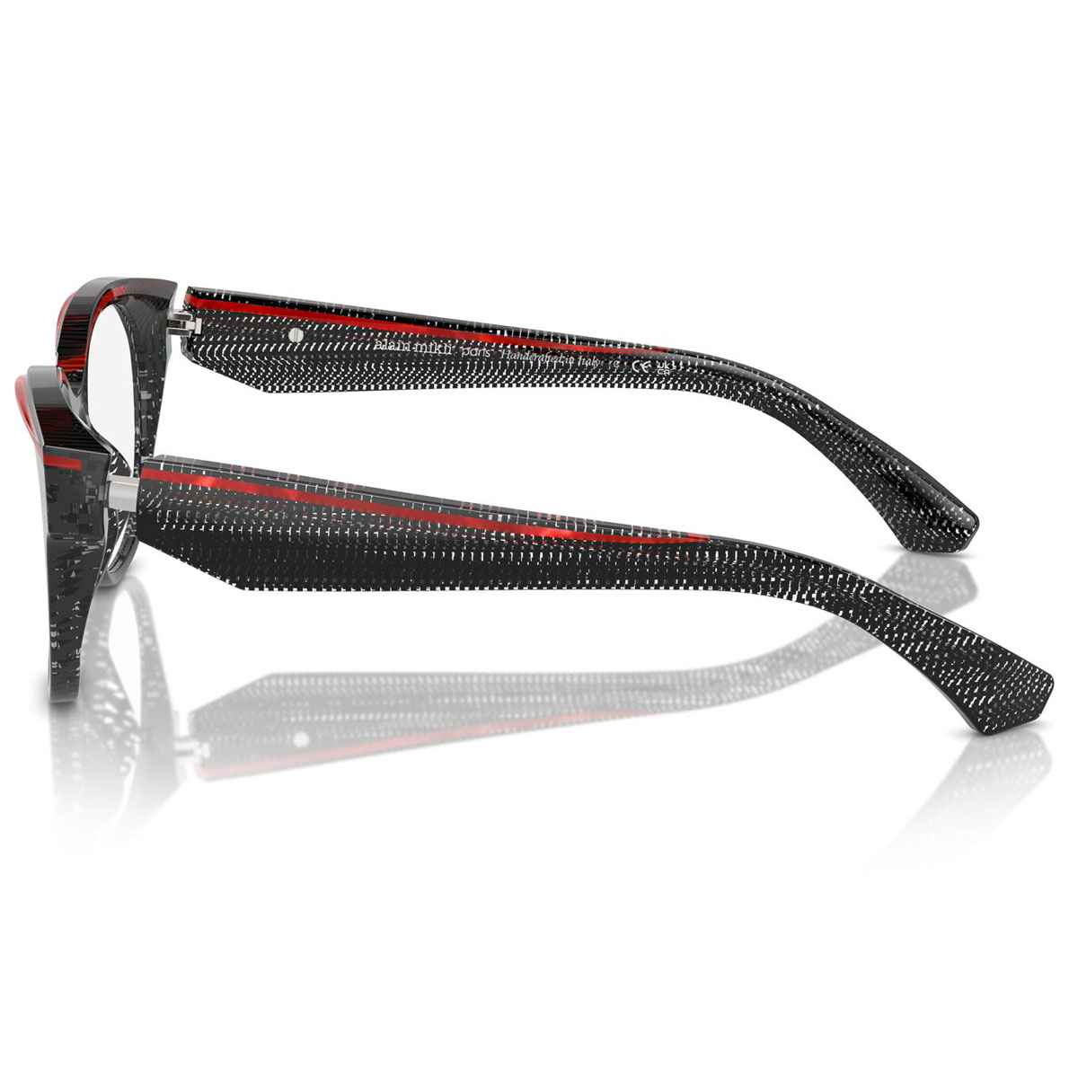 見る角度によって透ける部分が変わるブラックとクリアの点描柄の生地を採用。アイラインのようにレッドを挿し色にした生地は、アート作品のような美しさで、アランミクリならではの上質感を漂わせています。