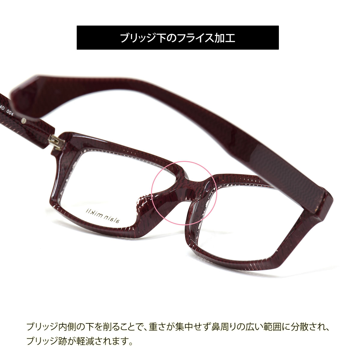 ブリッジ周辺を丁寧に削り加工することで、重量が均等に分散され、圧迫ポイントが軽減され鼻に跡が付くのを軽減されます。