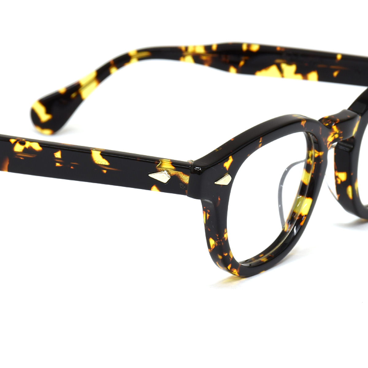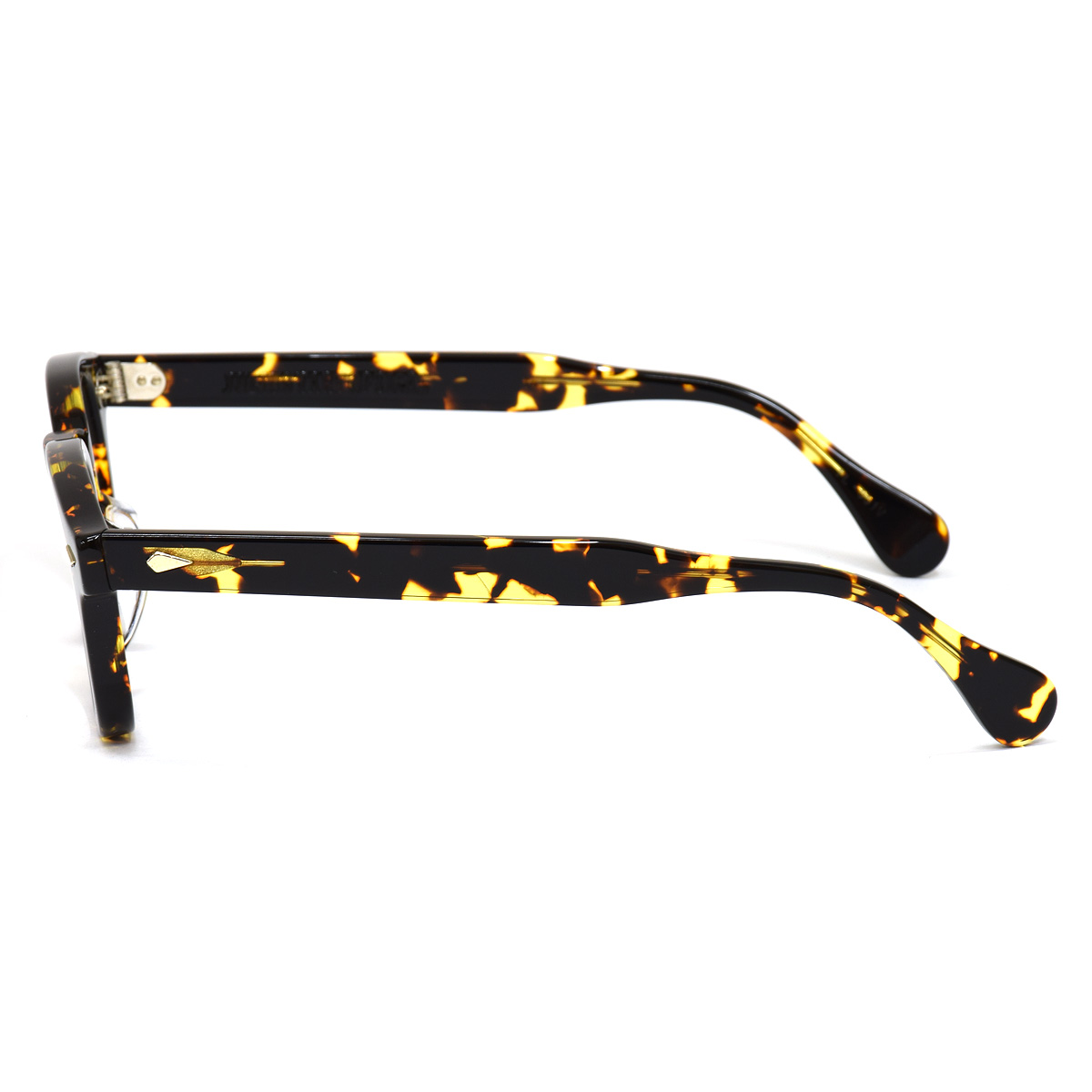 フレーム本体からわずかに浮かび上がるダイヤ型メタルパーツ(スタッズ)は、静かなる意志の煌めきを纏い、フロントとテンプルの継ぎ目には、あえて段差を残すことで生まれる構造美。