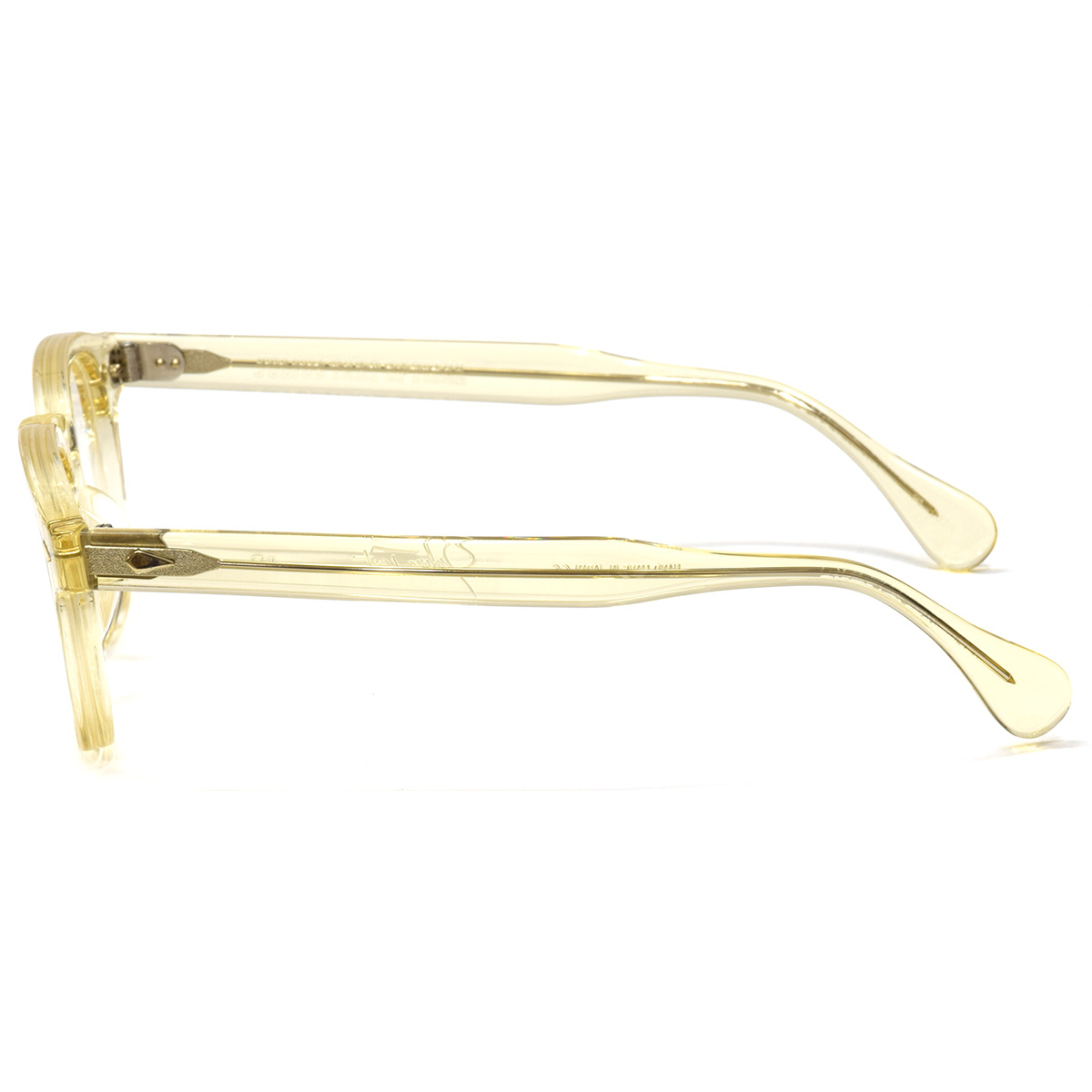 フレーム本体からわずかに浮かび上がるダイヤ型メタルパーツ(スタッズ)は、静かなる意志の煌めきを纏い、フロントとテンプルの継ぎ目には、あえて段差を残すことで生まれる構造美。