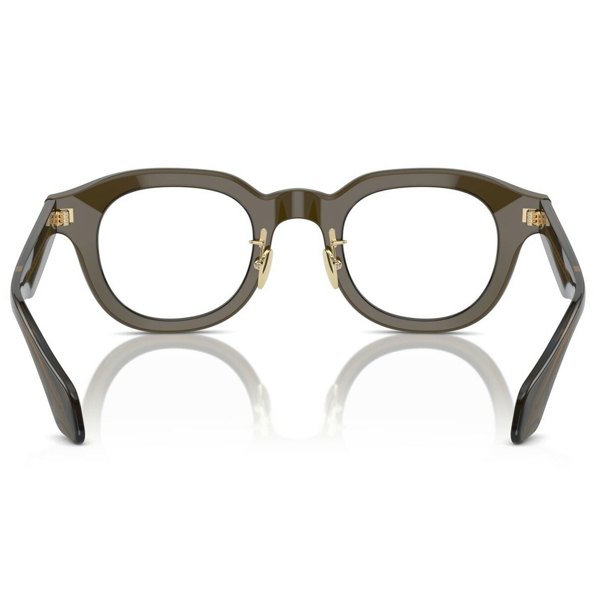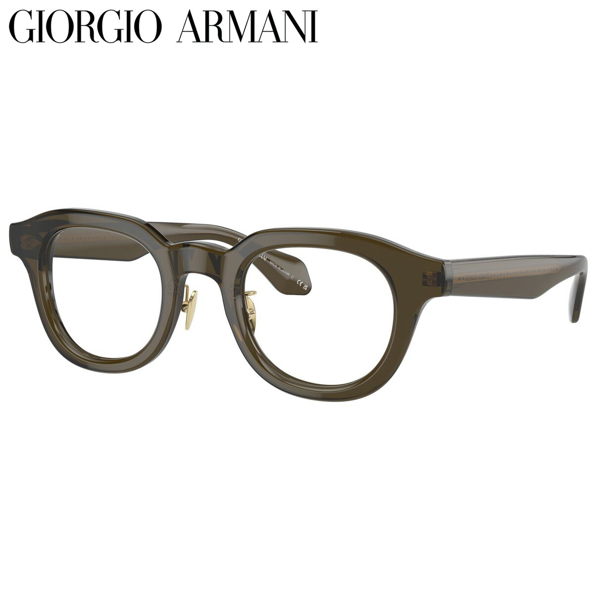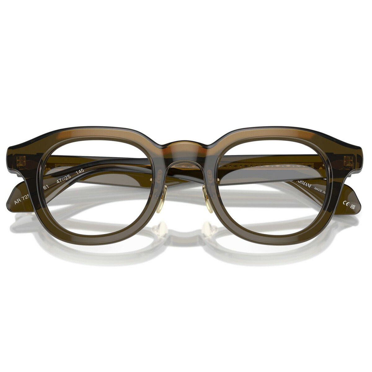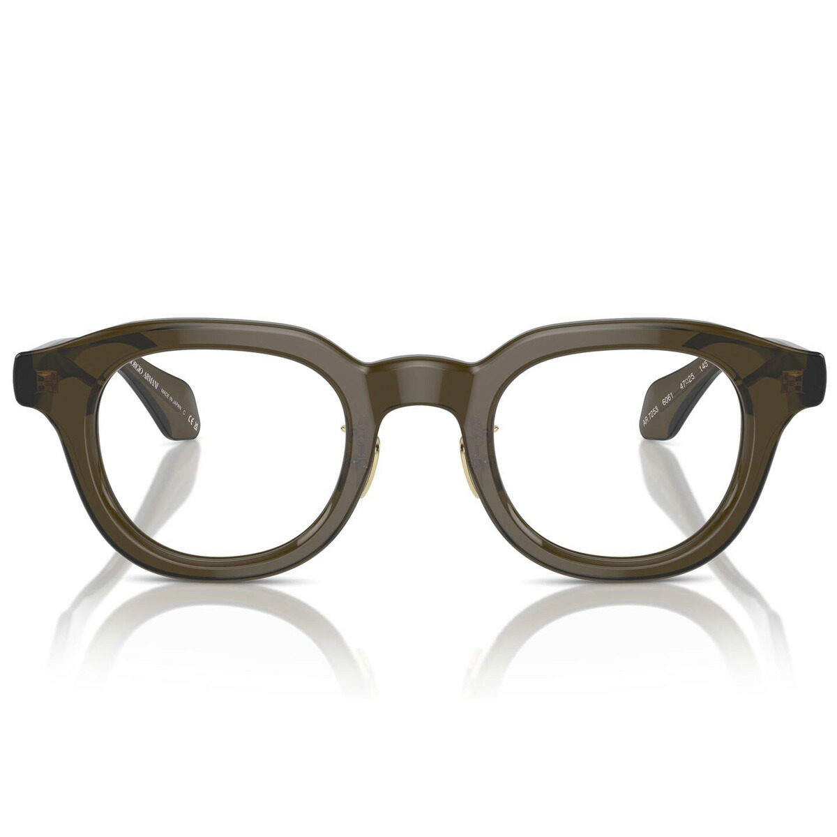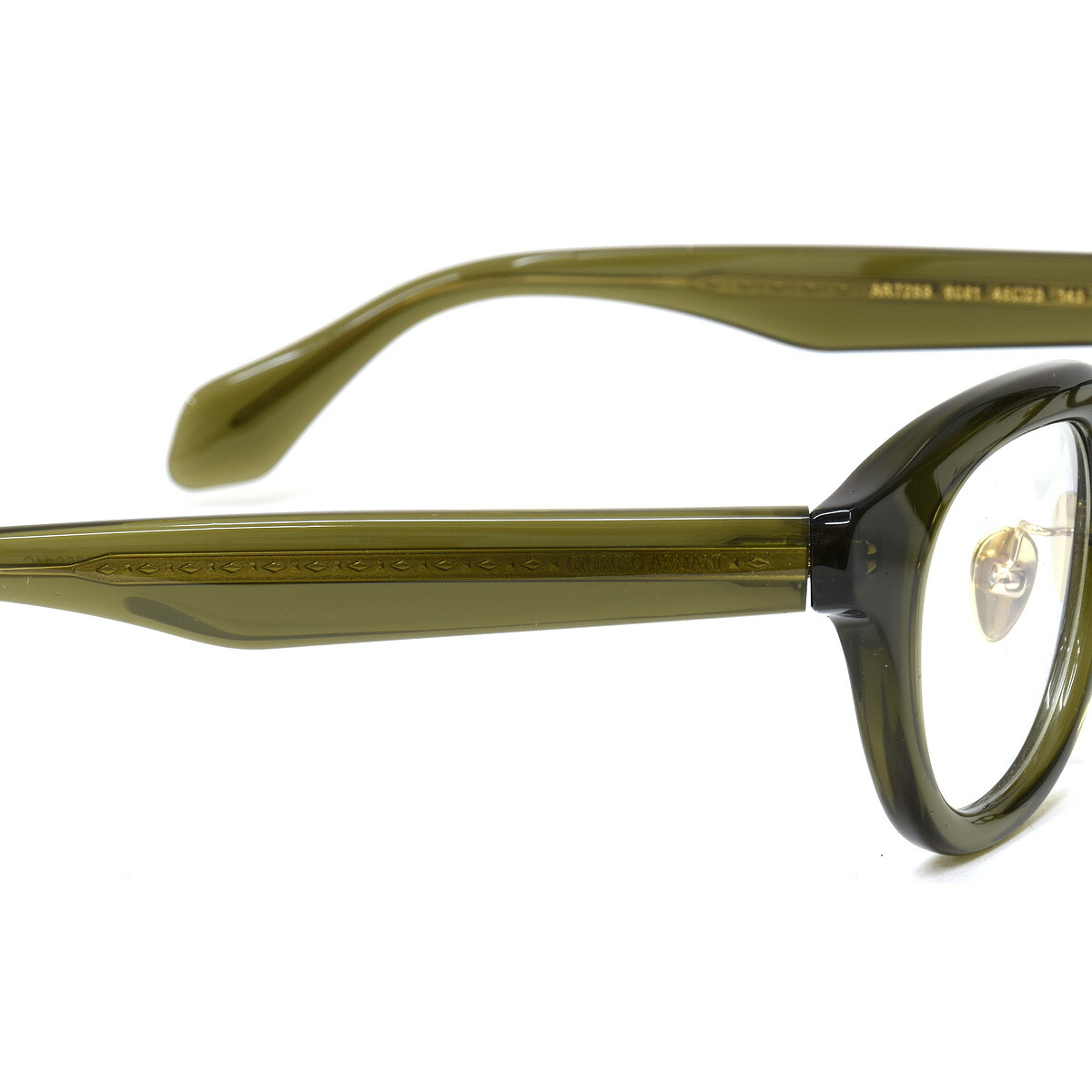 「Color:6061」は、画像では伝わりにくいですが透け感のあるくすみグリーンです。テンプルは、ジョルジオ アルマーニのロゴとひし形パターンが並ぶメタルコアが透けて見える仕様で、ハイブランドならではの高級感を醸し出しています。