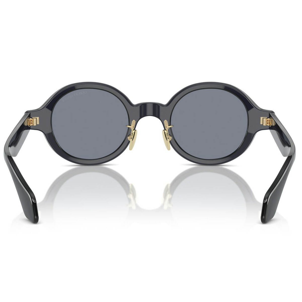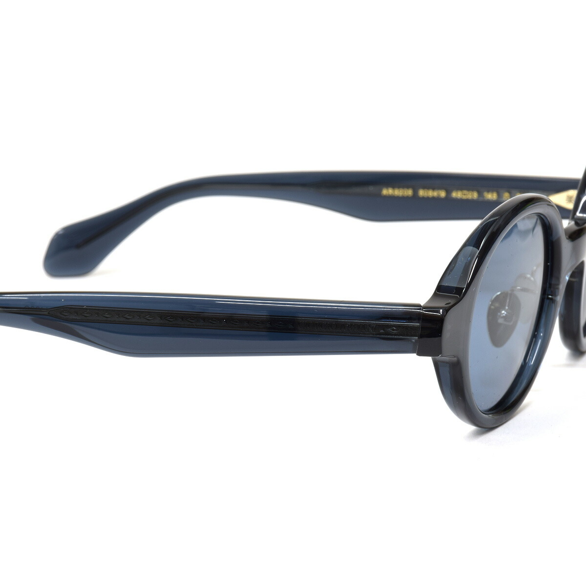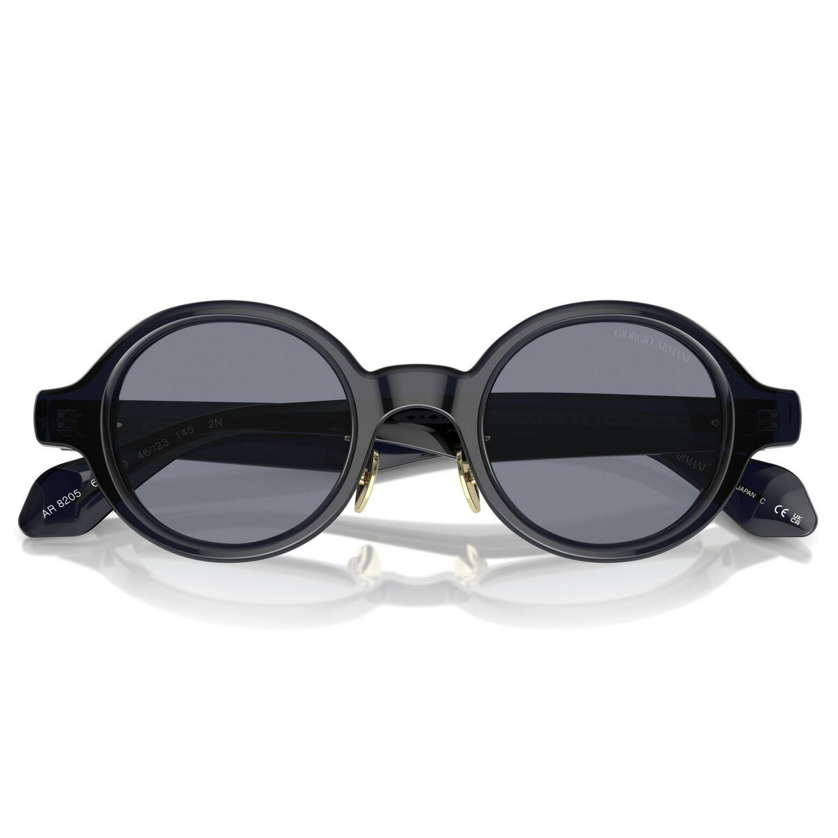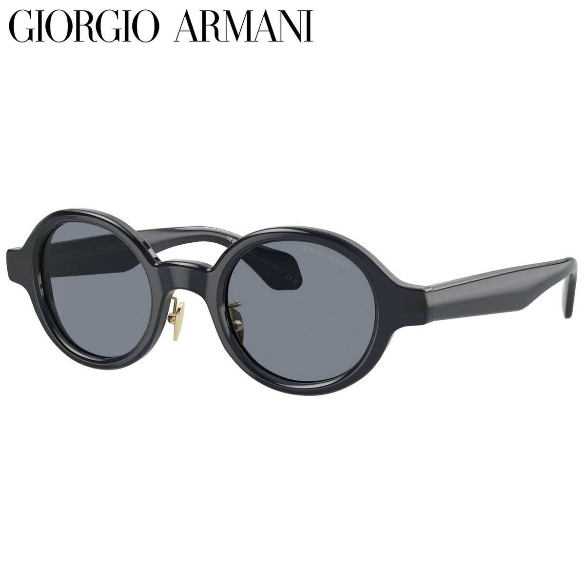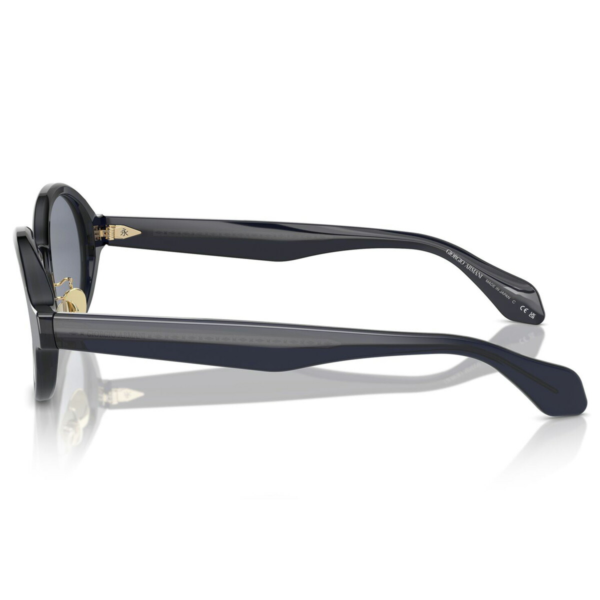 「Color:606419」は、画像では伝わりにくいですが透け感のあるディープブルーです。テンプルは、ジョルジオ アルマーニのロゴとひし形パターンが並ぶメタルコアが透けて見える仕様で、ハイブランドならではの高級感を醸し出しています。
