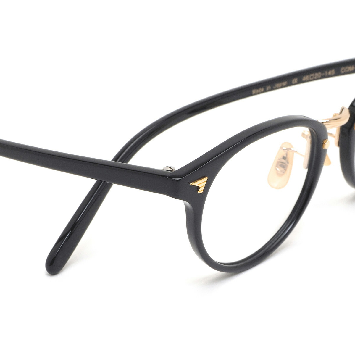 艶やかなプラスチックフレームのブリッジにゴールドメタルを合わせたコンビネーションフレーム。