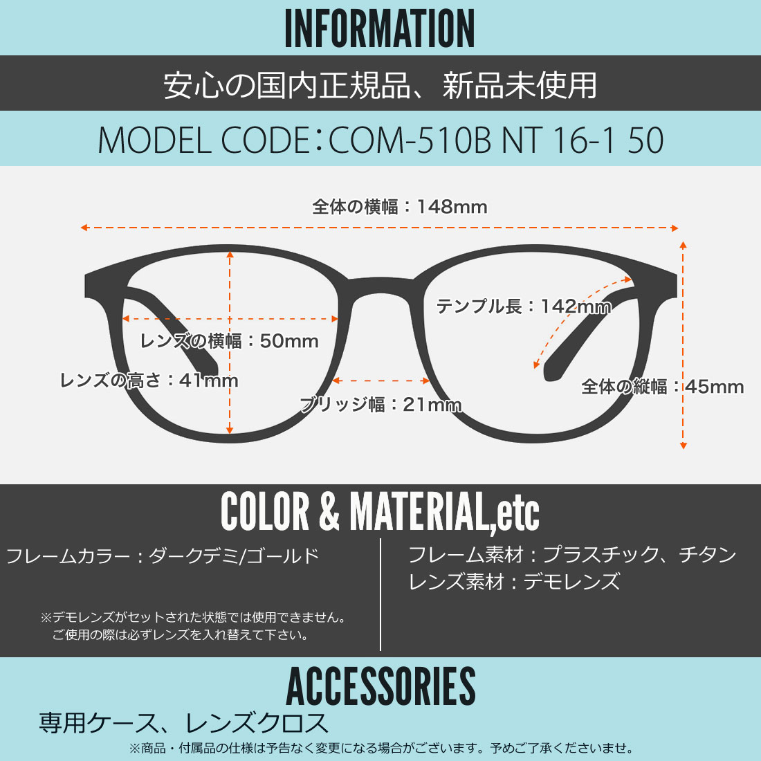 艶やかなプラスチックと、繊細で高級感漂うチタンとの組み合わせがエレガントなコンビネーションフレーム。COM-510NNT(レンズサイズ48mm)とほぼ同じデザインですが、レンズ横幅を50mmにして男性にも掛けやすいサイズになっています。