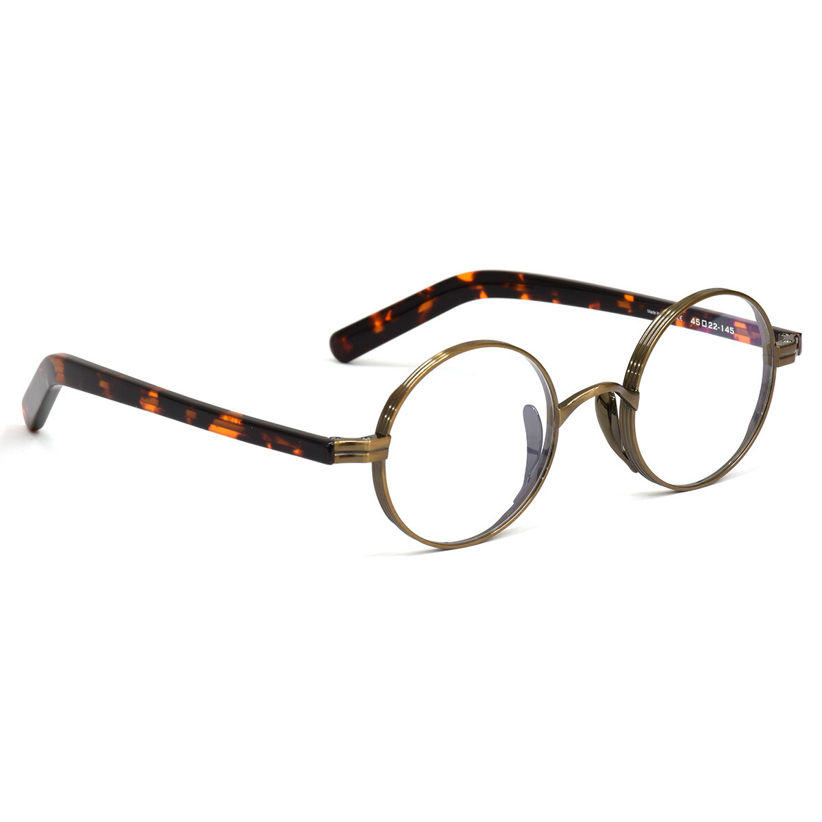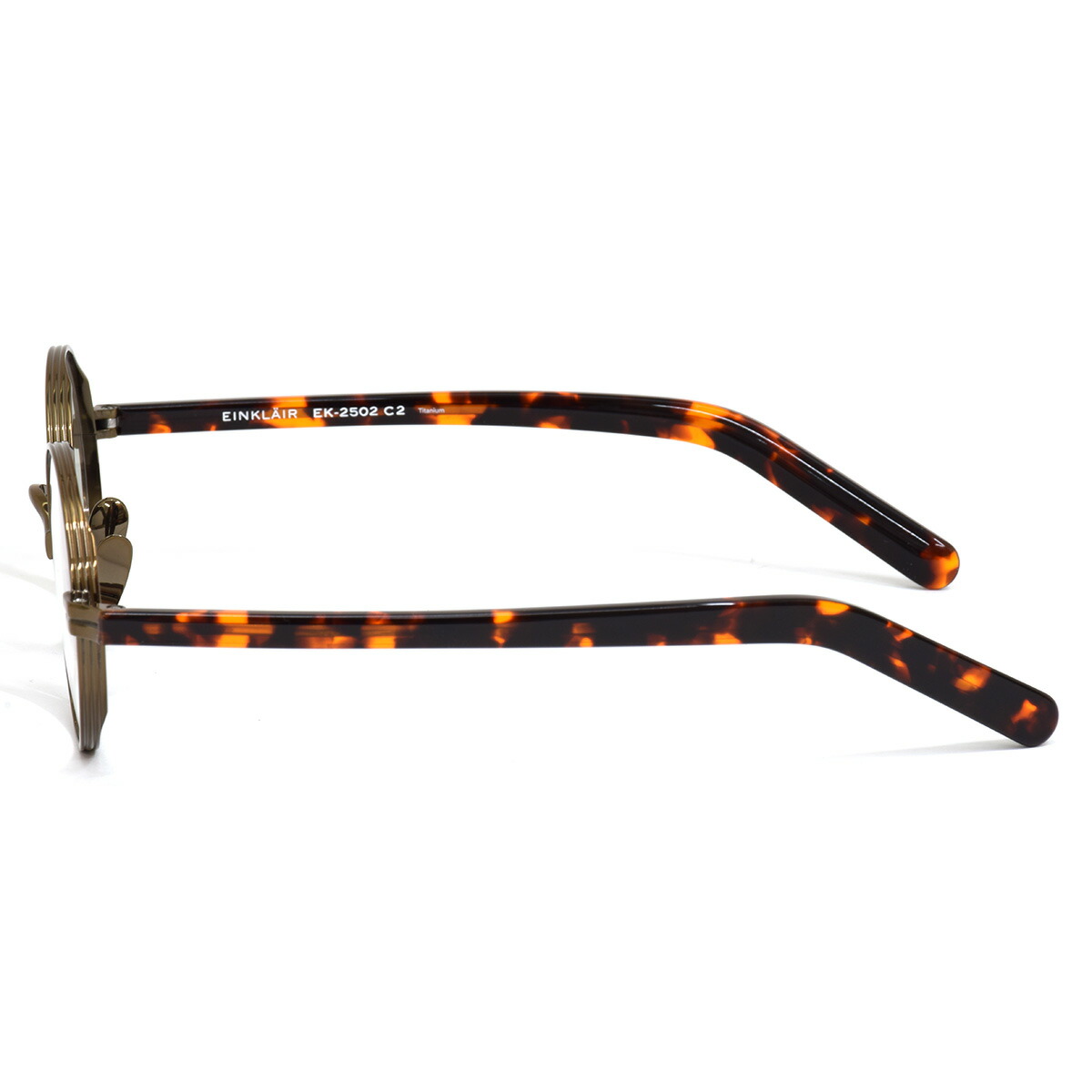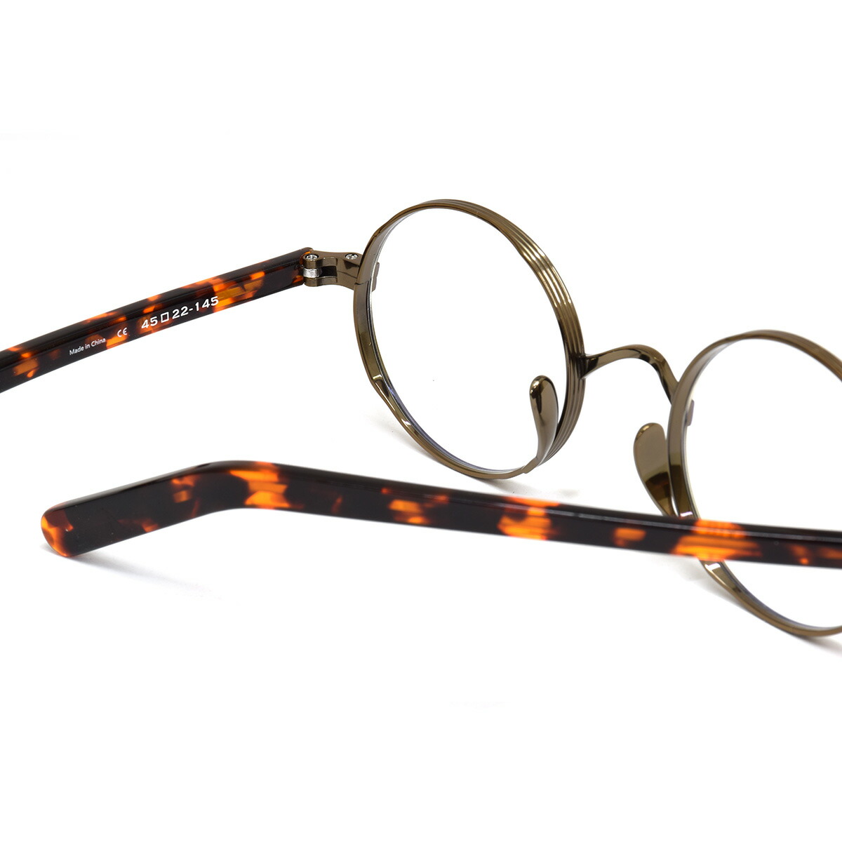 フロントには軽量で丈夫なチタン、テンプルには柔らかなプラスチックを採用した、コンビネーションフレームです。異なる素材のコントラストが、洗練された印象を与えます。クラシカルでありながらもモダンな雰囲気のラウンドフレームは、知的な表情を演出。サイドの存在感のあるテンプルが、横顔にさりげないアクセントを添えます。