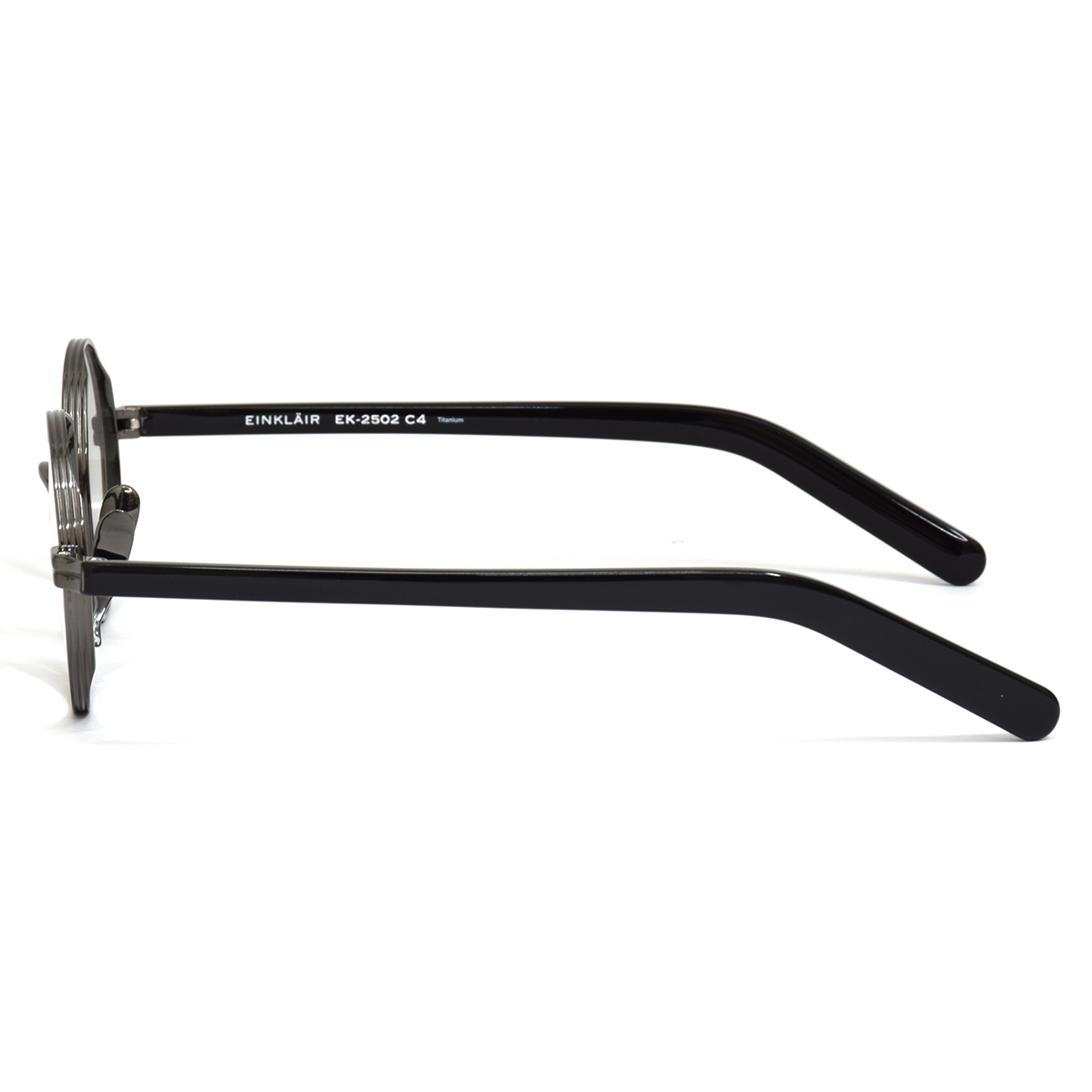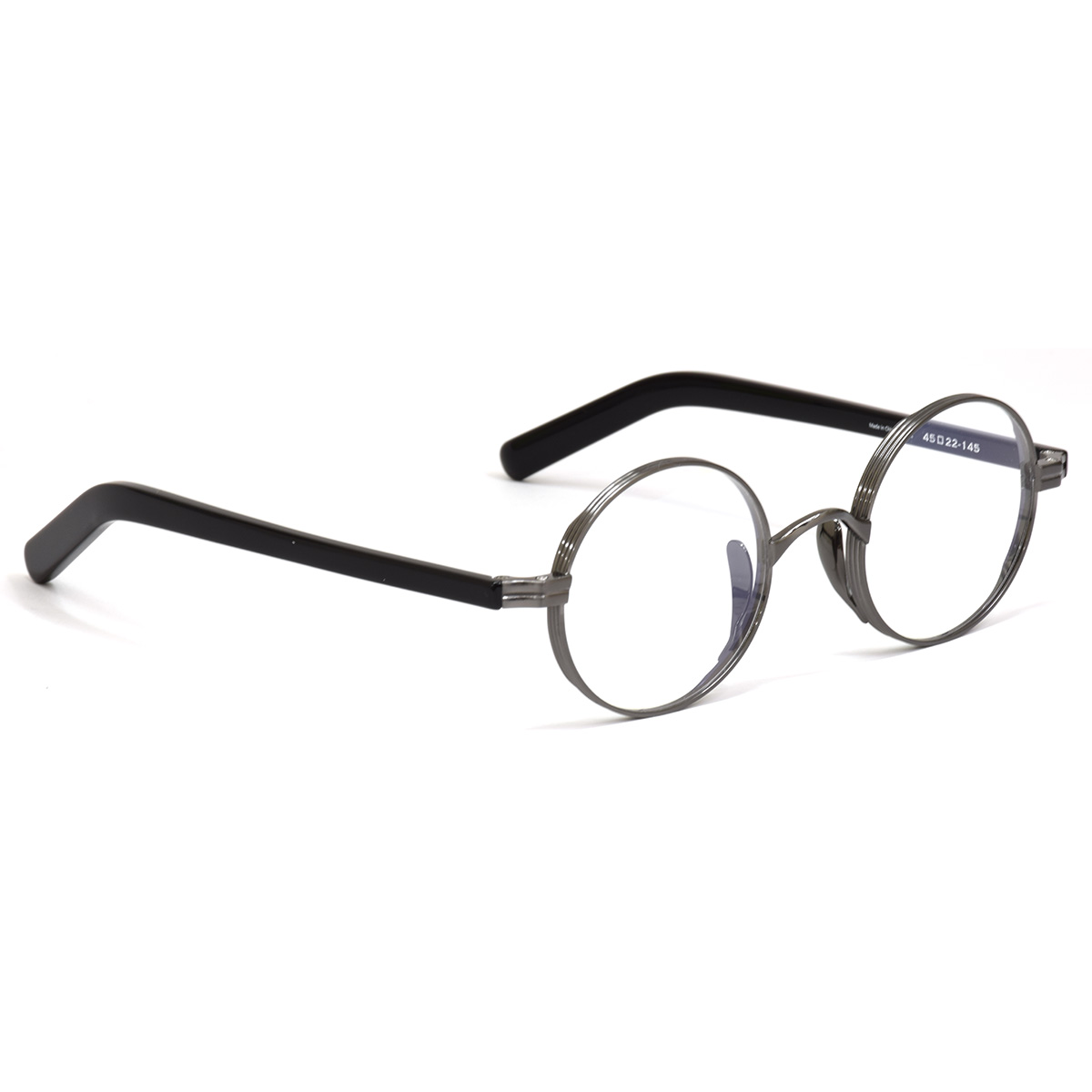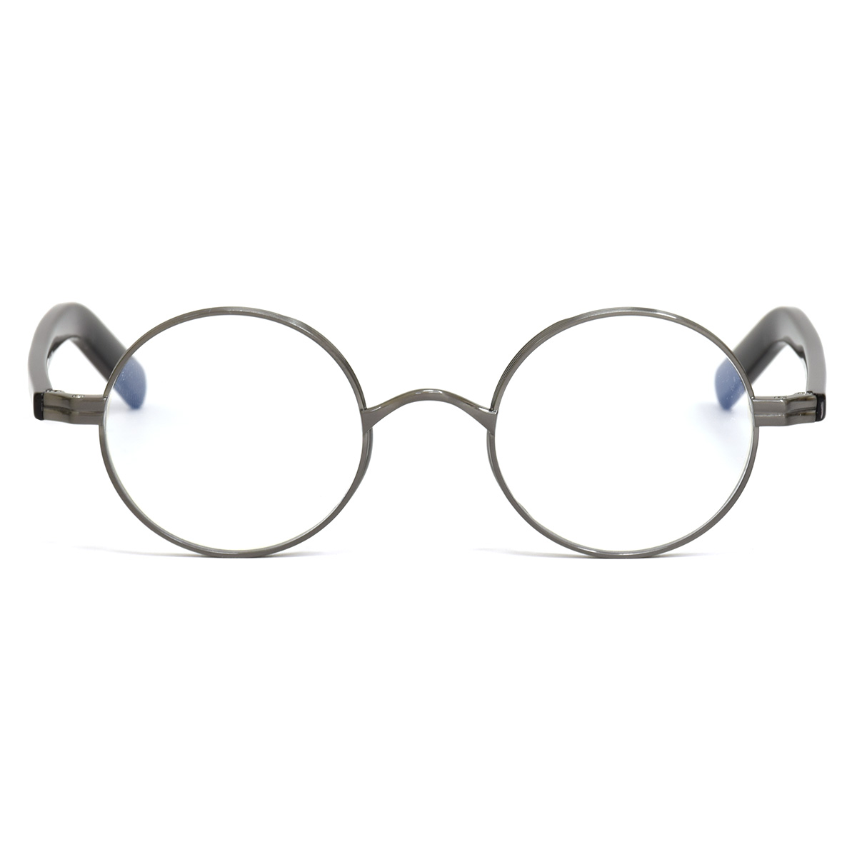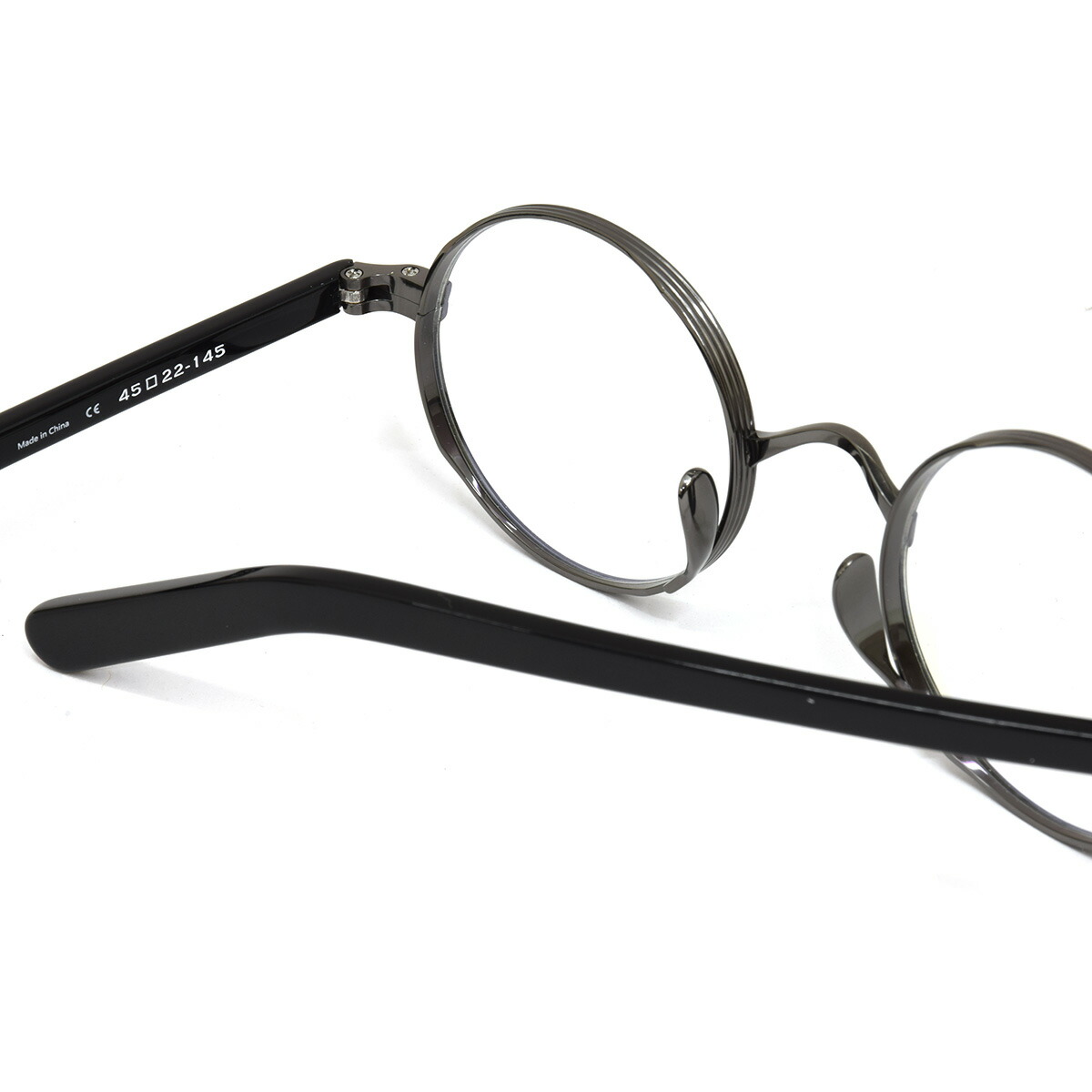 フロントには軽量で丈夫なチタン、テンプルには柔らかなプラスチックを採用した、コンビネーションフレームです。異なる素材のコントラストが、洗練された印象を与えます。クラシカルでありながらもモダンな雰囲気のラウンドフレームは、知的な表情を演出。サイドの存在感のあるテンプルが、横顔にさりげないアクセントを添えます。