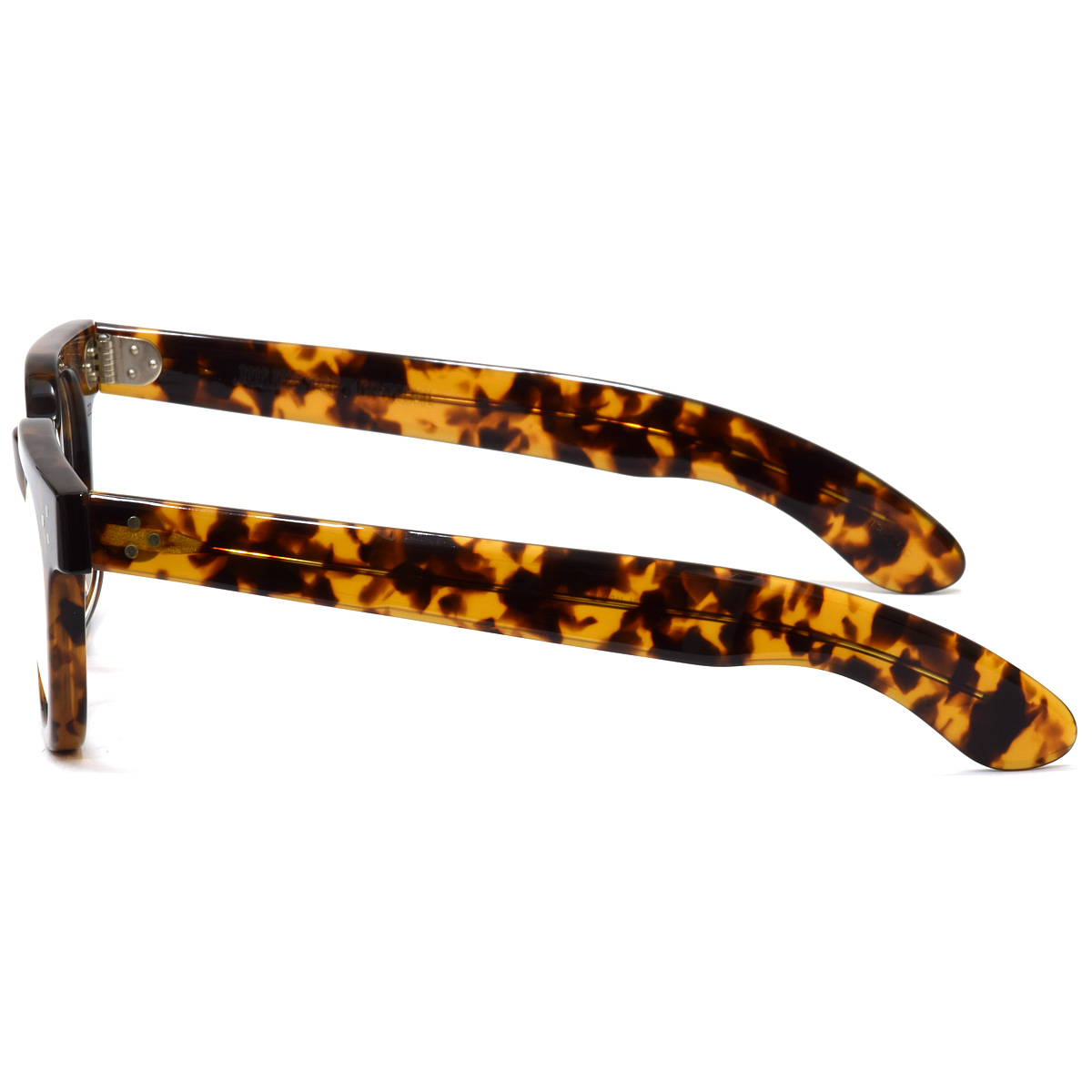 デザインの特徴として、フロントには3点カシメ鋲が施され、洗練された印象を与えます。幅広のテンプルは、安定感と快適さを提供し、テンプルエンドのエッジ感がスタイリッシュなアクセントとなっています。また、フロントからテンプルにかけて流れるような美しいラインは、全体のシルエットを引き立て、洗練された印象を与えます。