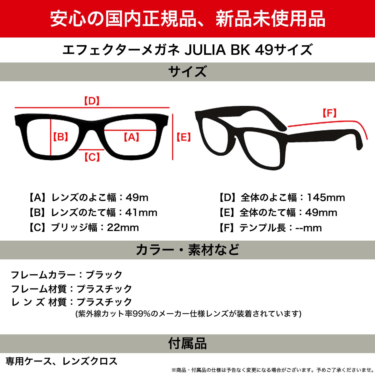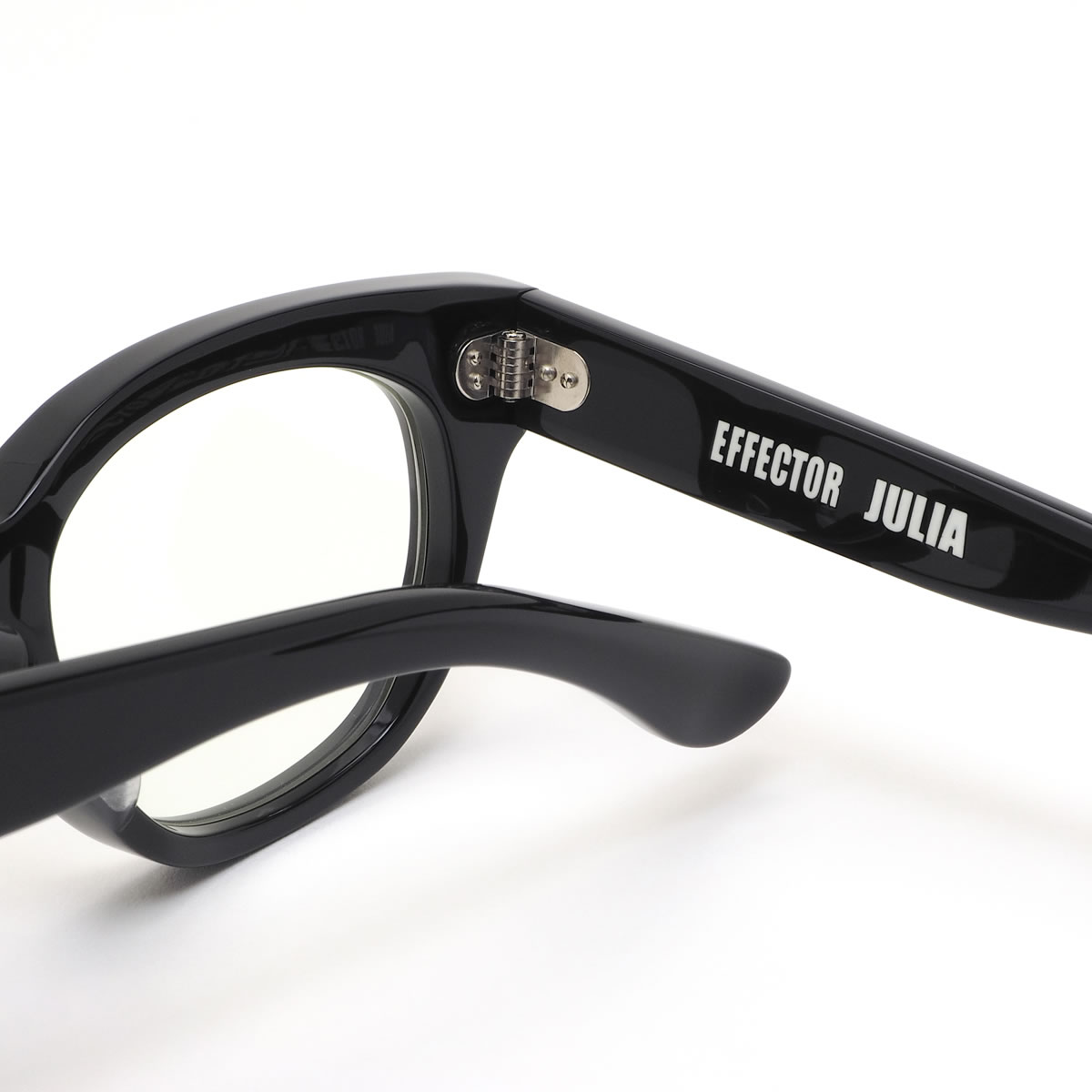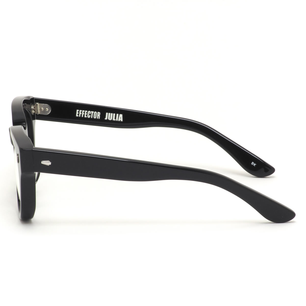 EFFECTORらしい肉厚でボチューム感のある、ボストンシェイプを意識したデザイン。 スッとサイドに流れるブローラインの先、智元にボリュームを持たせることでフォックス型にも見える不思議なフォルムです。山なりのキーホールブリッジが求心的なイメージで、全体を引き締めるアクセントになっています。優雅さ漂う、新しいEFFECTORスタイル“JULIA”は女性にもおススメしたいモデルです。 「BK:ブラック」はツヤのあるブラックのフレームに、 紫外線カット率99%のメーカー仕様クリアレンズがはめられています。そのままダテメガネやクリアサングラスとしてお使いいただけます。もちろんお度数付きレンズ(レンズ選択肢からお選びください)に入れ替えてご使用いただくことも可能です。
