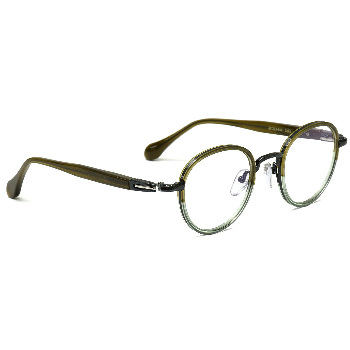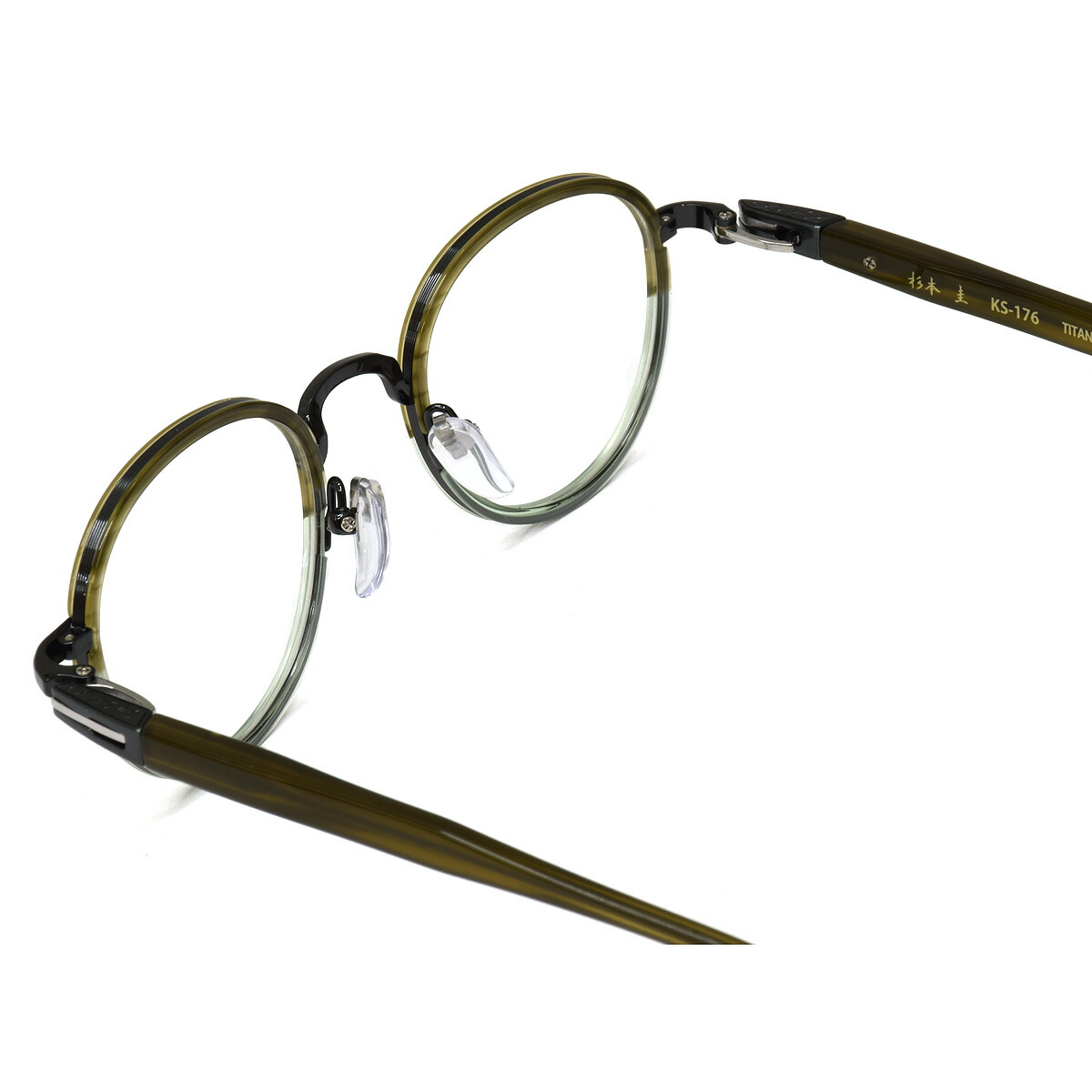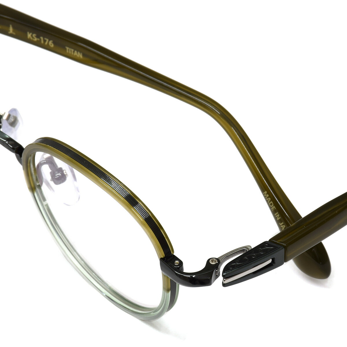 正面から見た時はセルフレームのようでいて、角度を変えるといくぶん厚みのあるメタルが見え「メタルフレーム」とも「セルフレーム」ともひと味違う独特の雰囲気が漂っています。