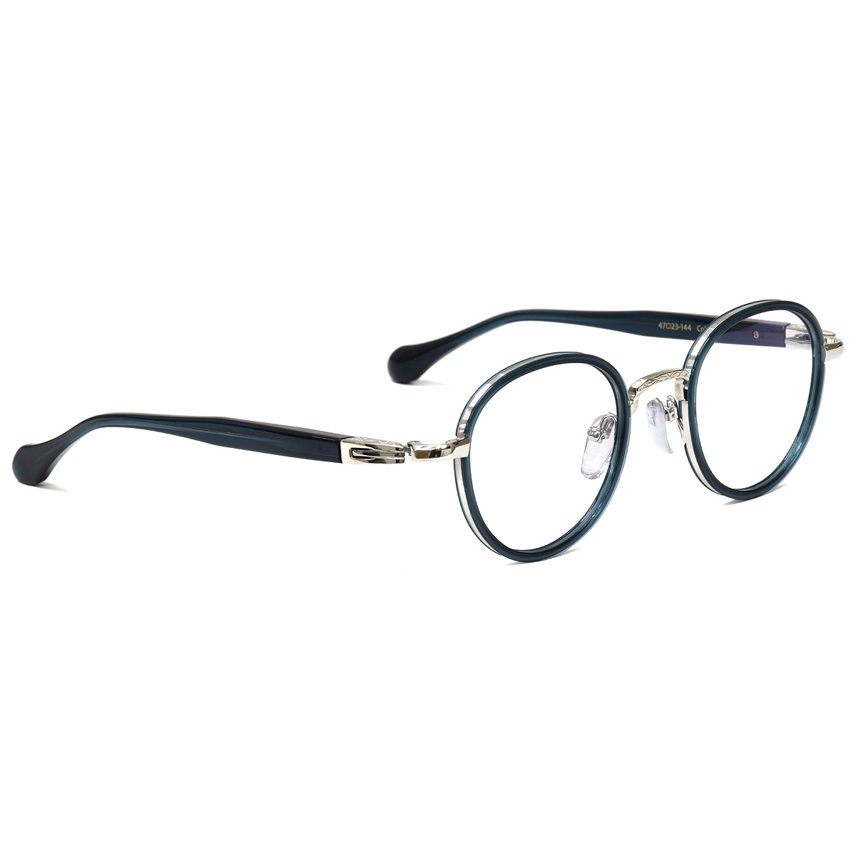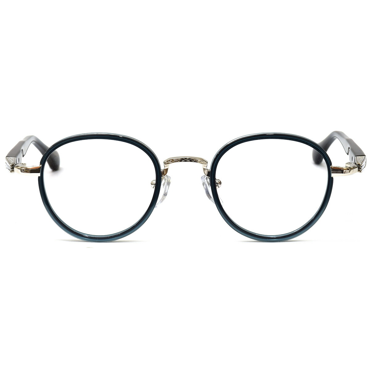 正面から見た時はセルフレームのようでいて、角度を変えるといくぶん厚みのあるメタルが見え「メタルフレーム」とも「セルフレーム」ともひと味違う独特の雰囲気が漂っています。