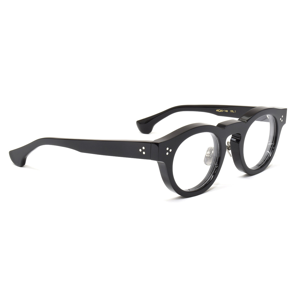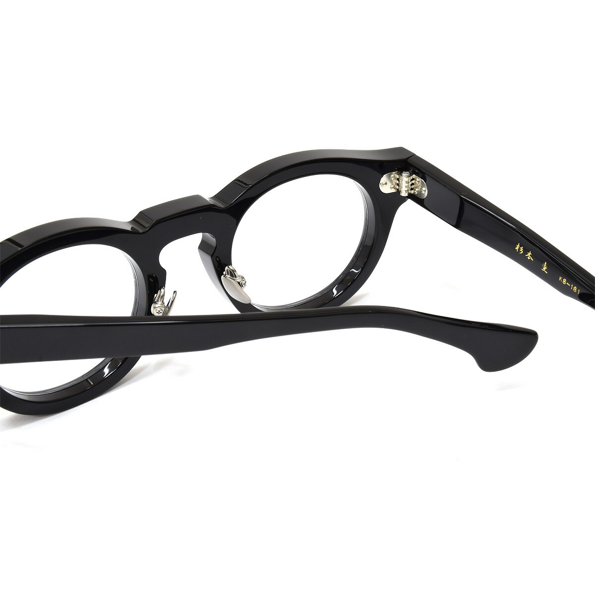 テンプルは、フロントに比べいくぶん薄めの生地で作られており、フロントから繋がる付近はしっかりカドを出しつつ、お耳に掛かる部分は面取りを施して肌あたりにも配慮されています。また、足付き鼻パッドを採用していますので、お顔立ちに合わせた調整が可能で掛け心地も快適です。