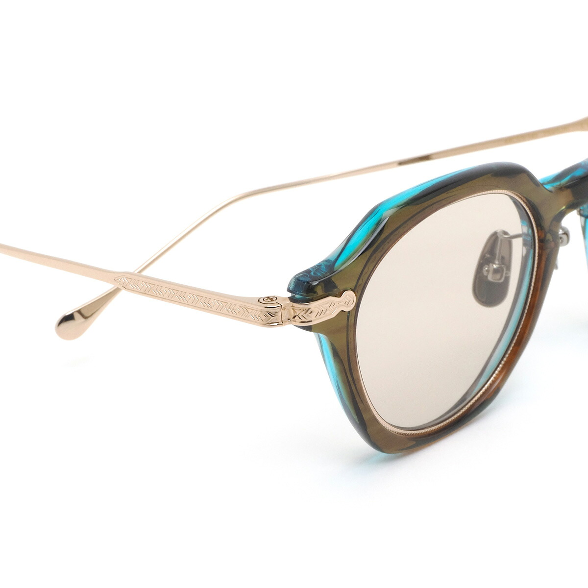 鮮やかなカラーの生地使いや、さりげないアシンメトリー、細かな彫金細工など、フレームの細部にまで職人の息づかいを感じさせる精緻なつくりは国産ならでは。