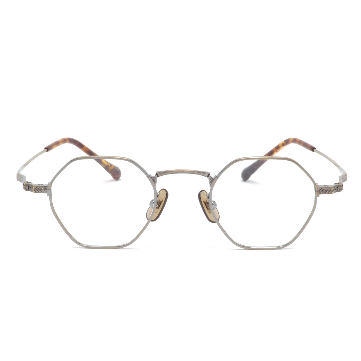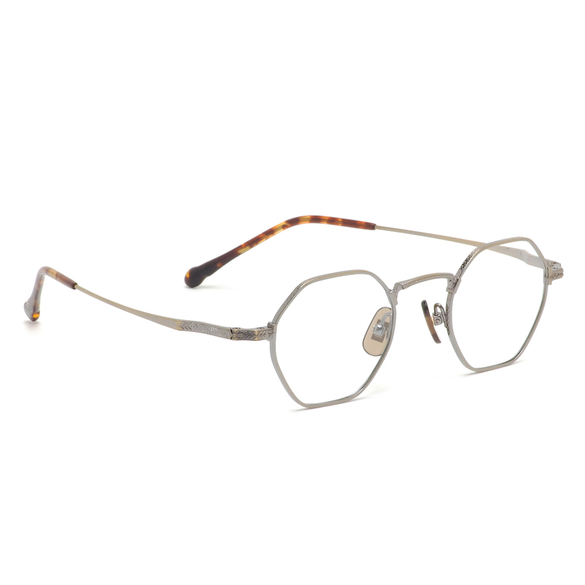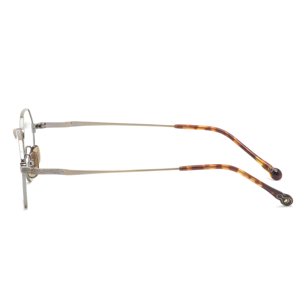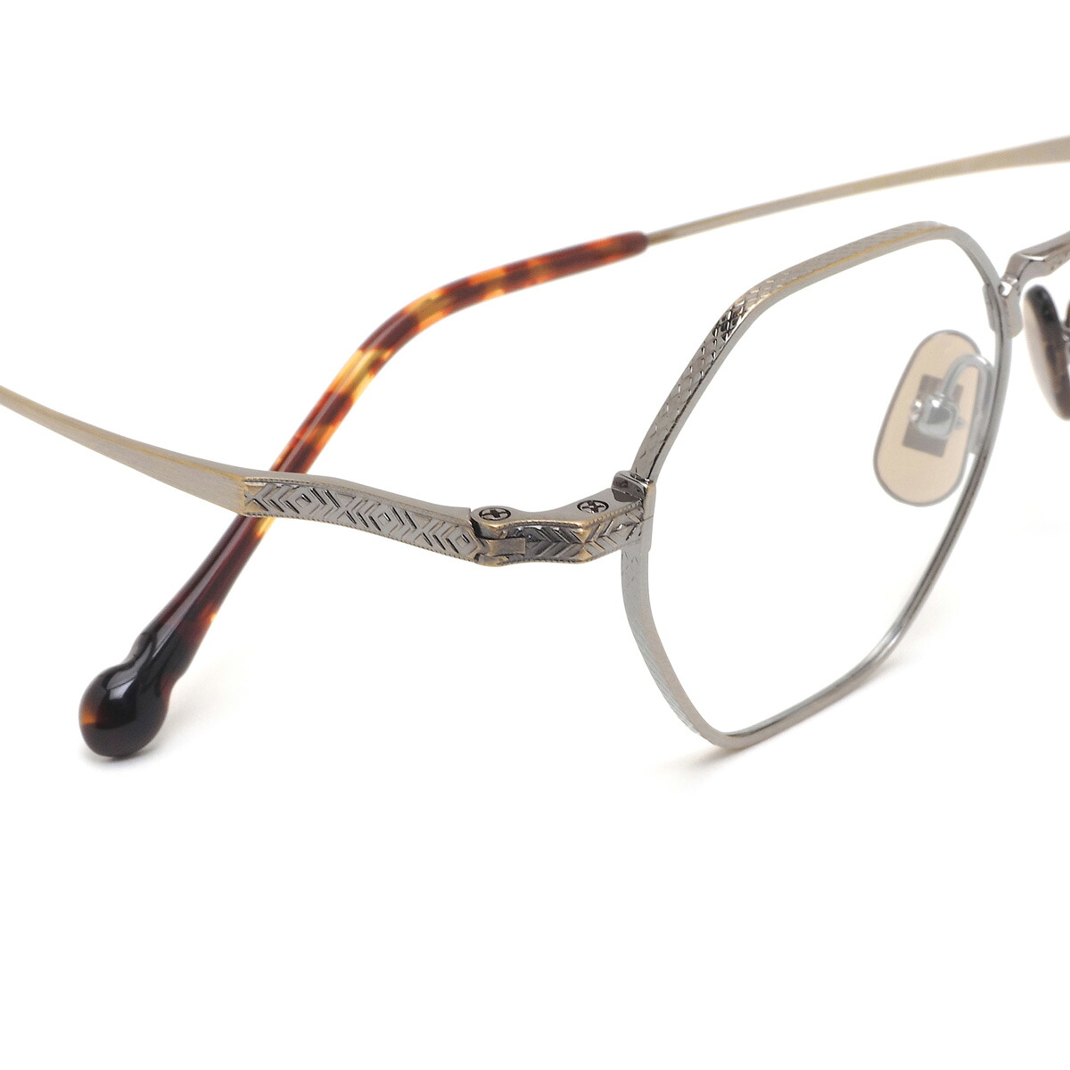 リム側面やブリッジ前面、ヨロイからテンプルヘッドにかけて、異なる文様の彫金が施されアート作品のような高級感を漂わせています。