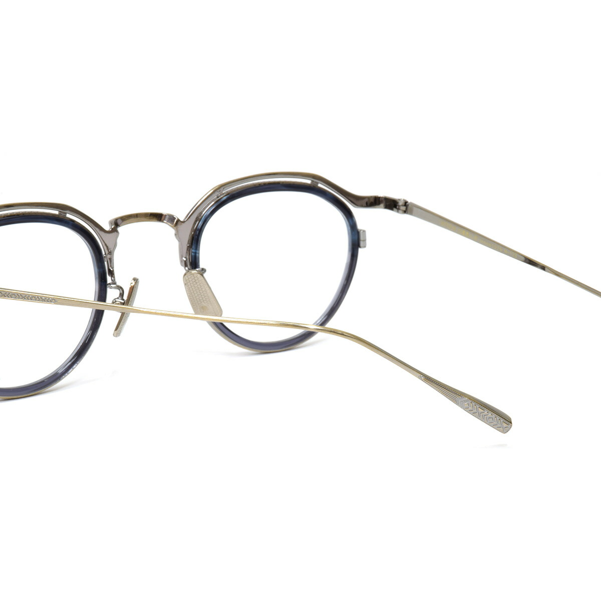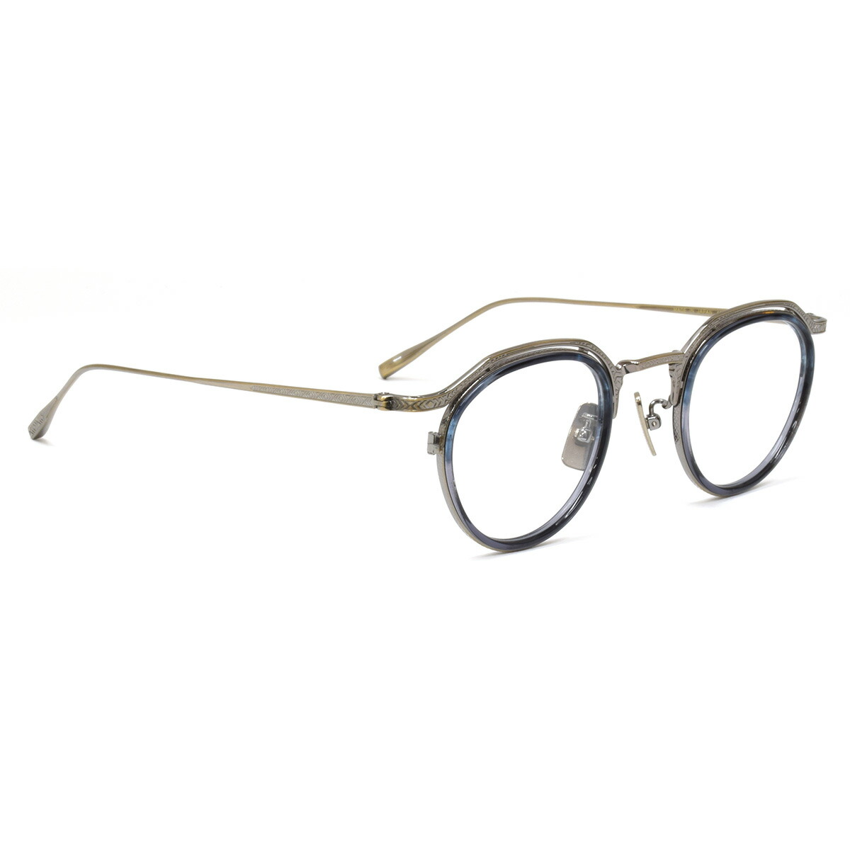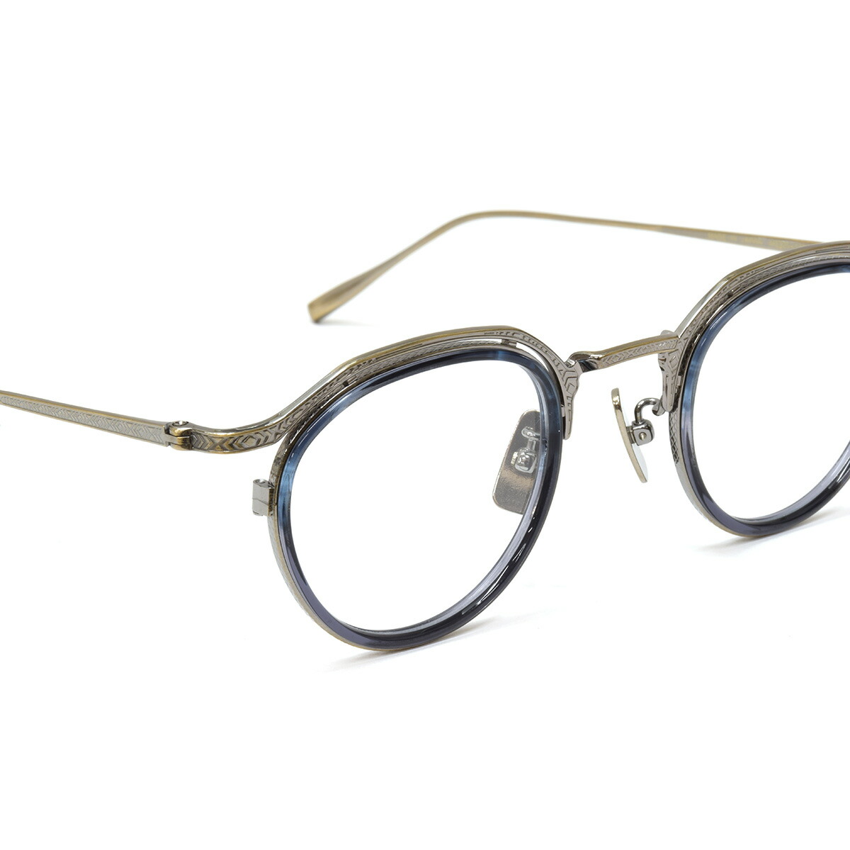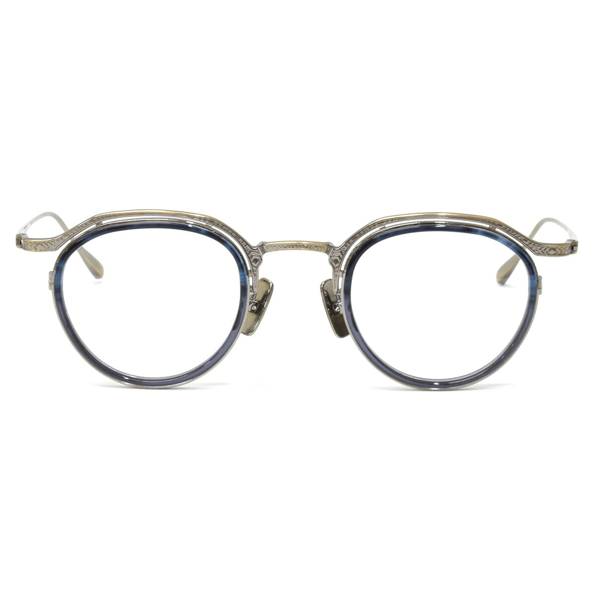 クラシカルなブロウスタイルに、装飾をあしらったブロウバー、ブリッジ、テンプル、テンプルエンドまで、細部に至るまで職人の美意識が宿るデザイン。インナーリムが立体感を生み、奥行きのある表情を演出します。すべての金属パーツにはチタンを採用し、軽量かつ高い耐久性を実現。鼻パッドにもメタル素材を使用することで、上質さと一体感が際立ちます。もちろん、日本製ならではの精緻な仕上がりも魅力。日常に、静かに凛とした存在感を添えるフレームです。