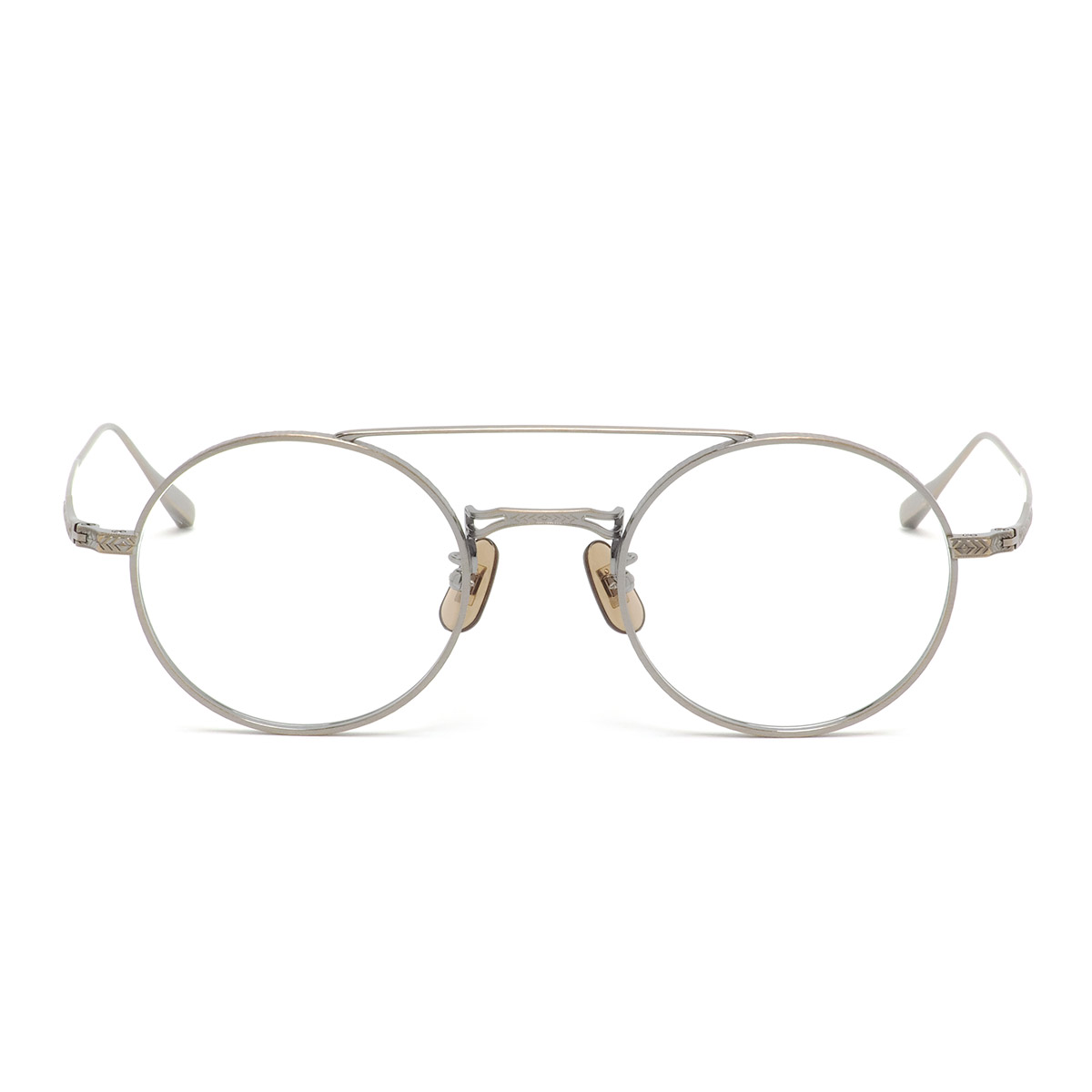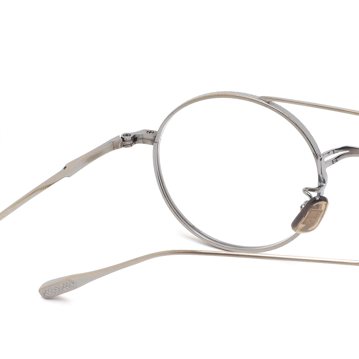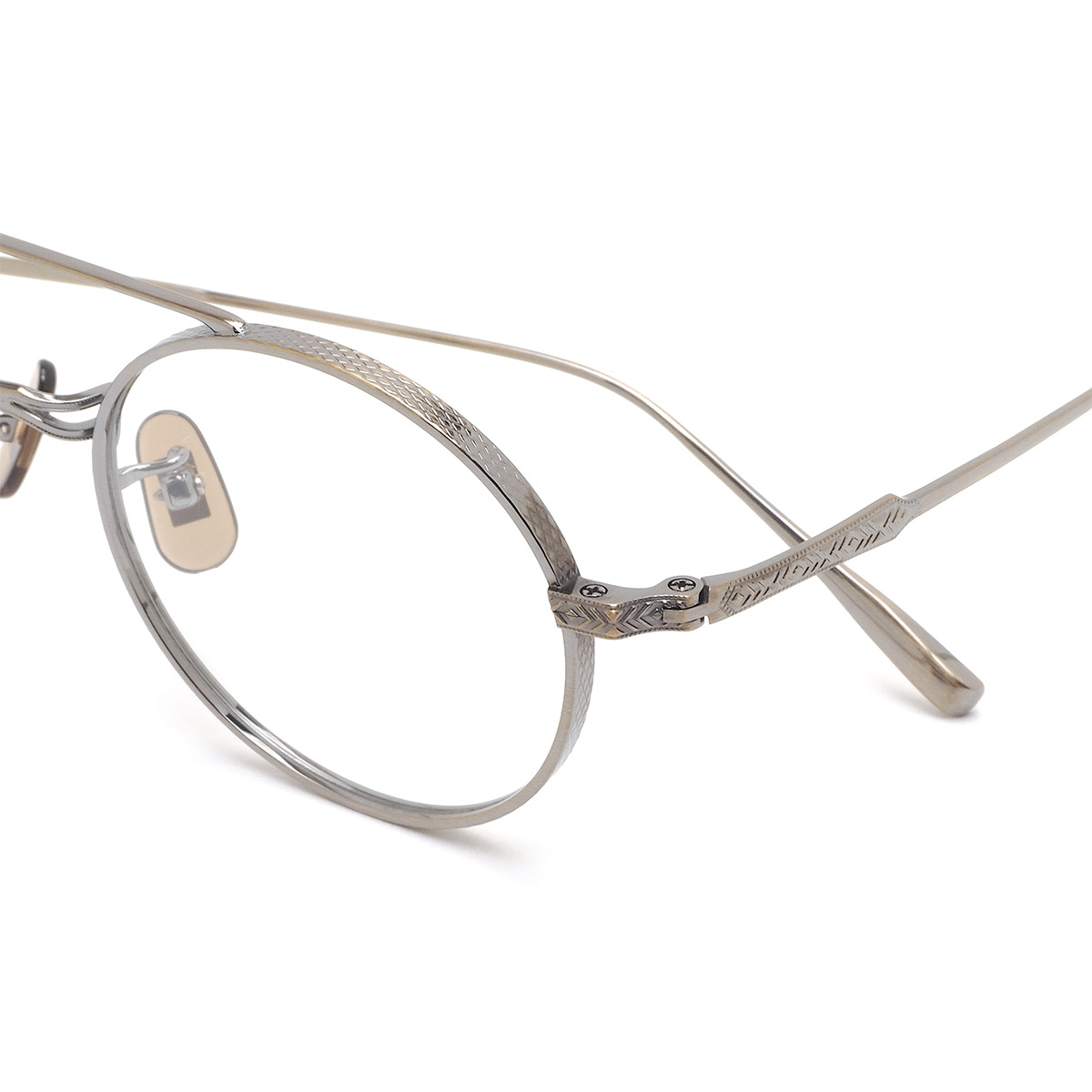 リム側面やブリッジ前面、ヨロイからテンプルヘッド・テンプルエンドにかけて異なる文様の彫金が施され、さながらアート作品のような高級感を漂わせています。