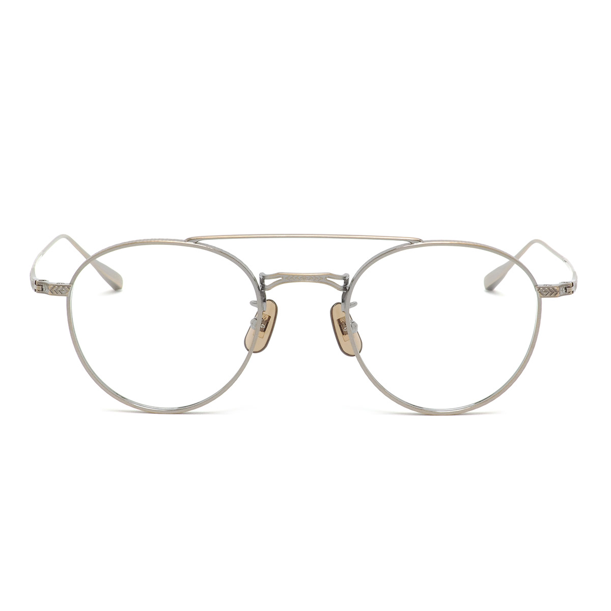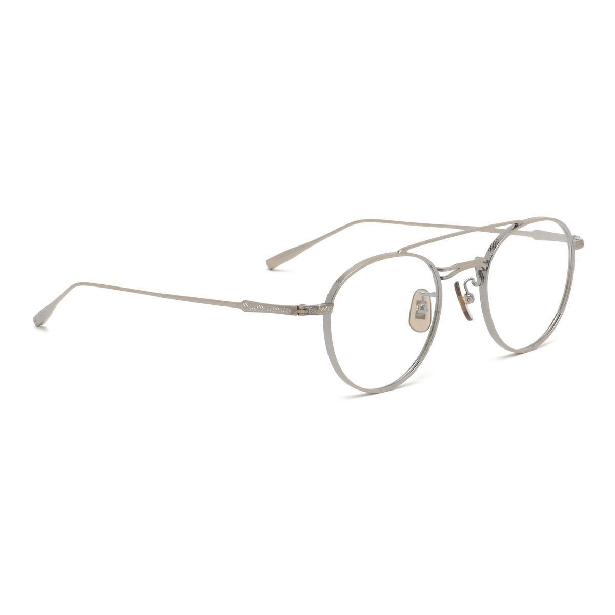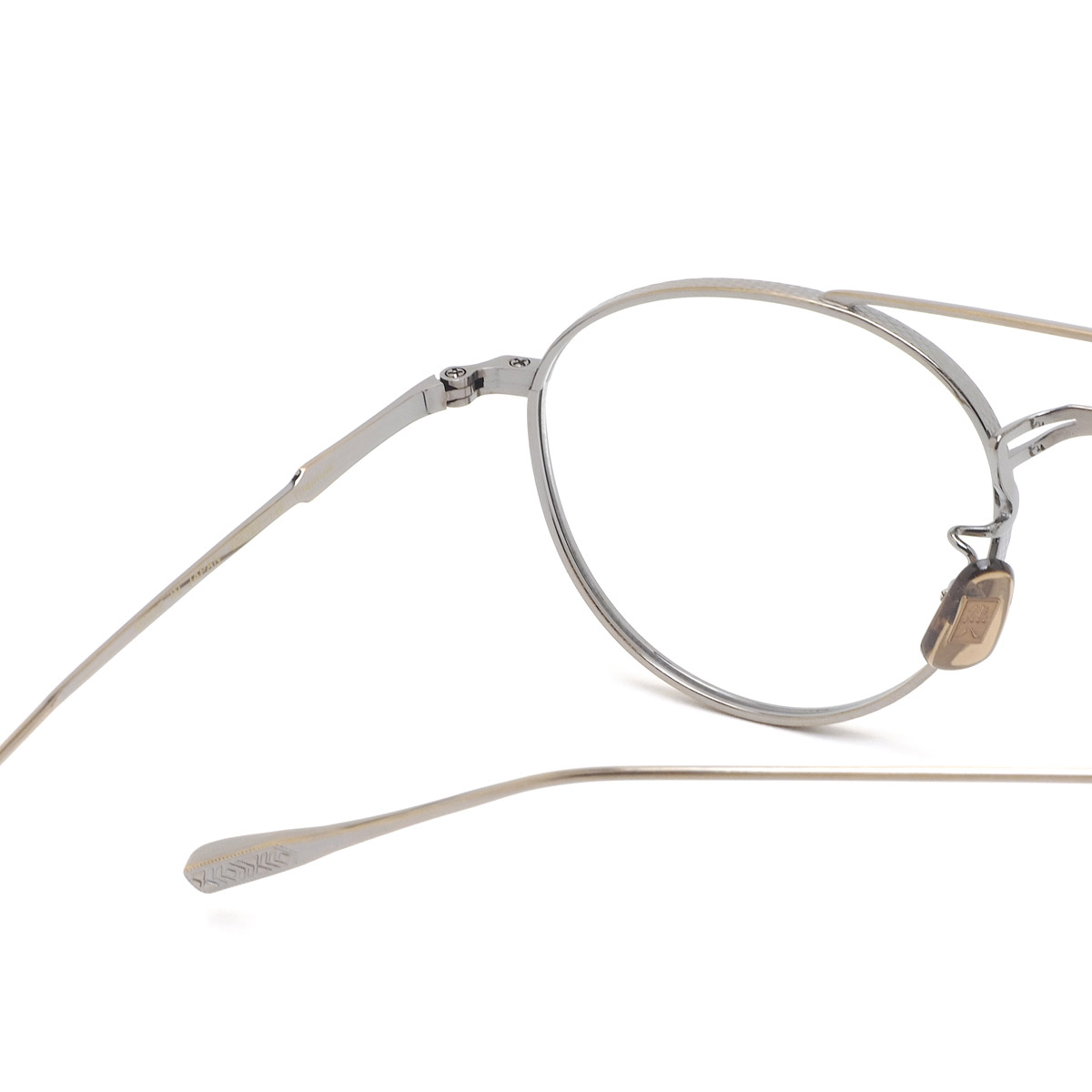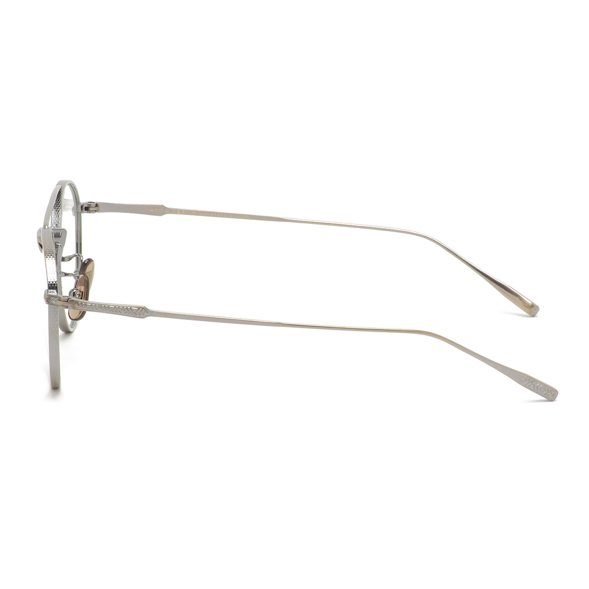 リム側面やブリッジ前面、ヨロイからテンプルヘッド・テンプルエンドにかけて異なる文様の彫金が施され、さながらアート作品のような高級感を漂わせています。