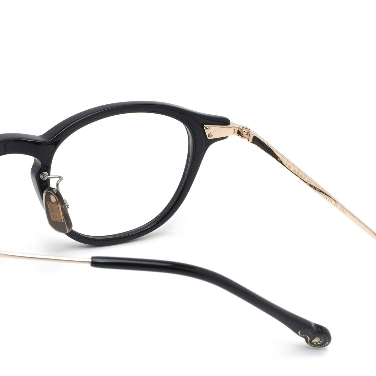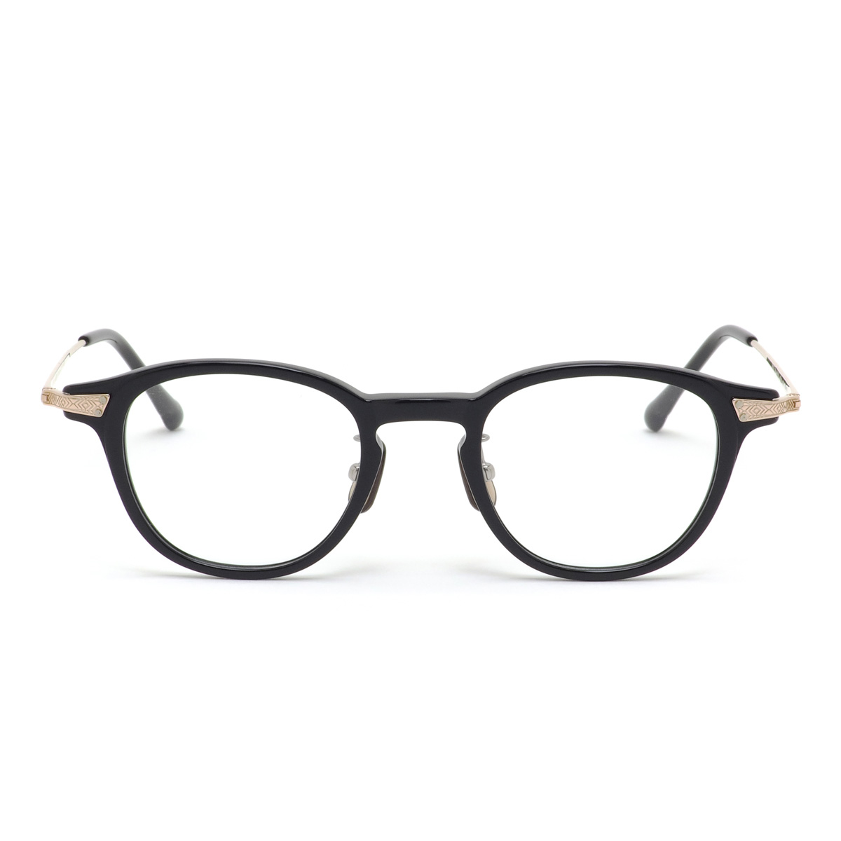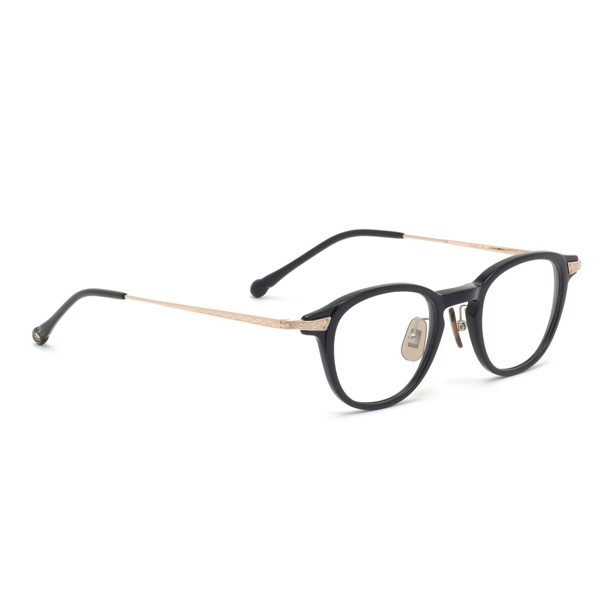 リム側面やテンプルのチタン部分には、繊細な文様の彫金が施されクラシカルな雰囲気が一層際立っています。また、テンプルエンドには熊の足形模様があしらわれ、作り手の遊び心が感じられます。鯖江のメガネ職人の確かな技術を形にした、メイドインジャパンの魅力的なアイウェアです。