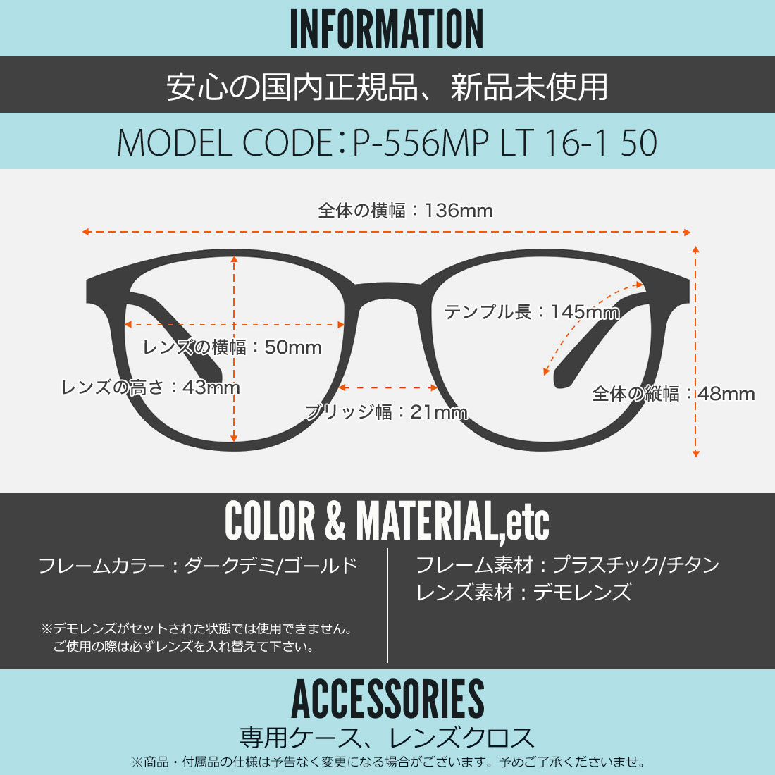 セルロイド素材の温かみと、チタンの軽快さが融合した「P-556MP LT」は、長時間掛けても疲れにくく、快適な掛け心地を提供します。
