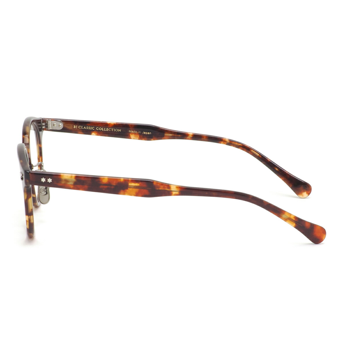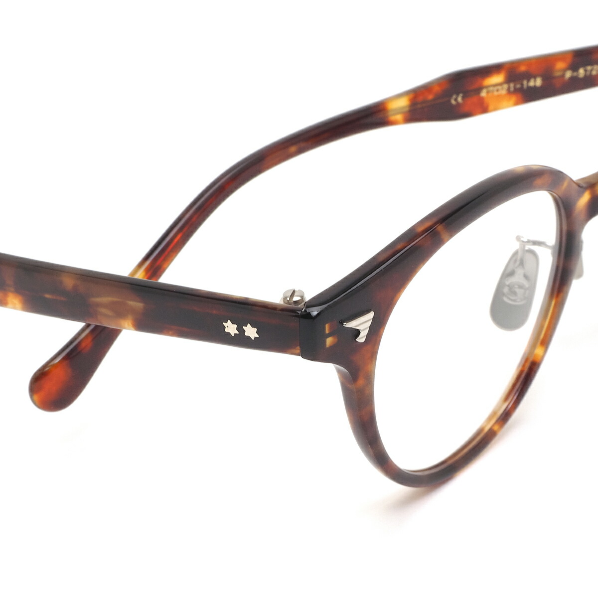 フロントサイドには翼の形の鋲、テンプルには星形のカシメ飾りを採用し、シンプルなフレームに遊び心のあるアクセントを加えています。