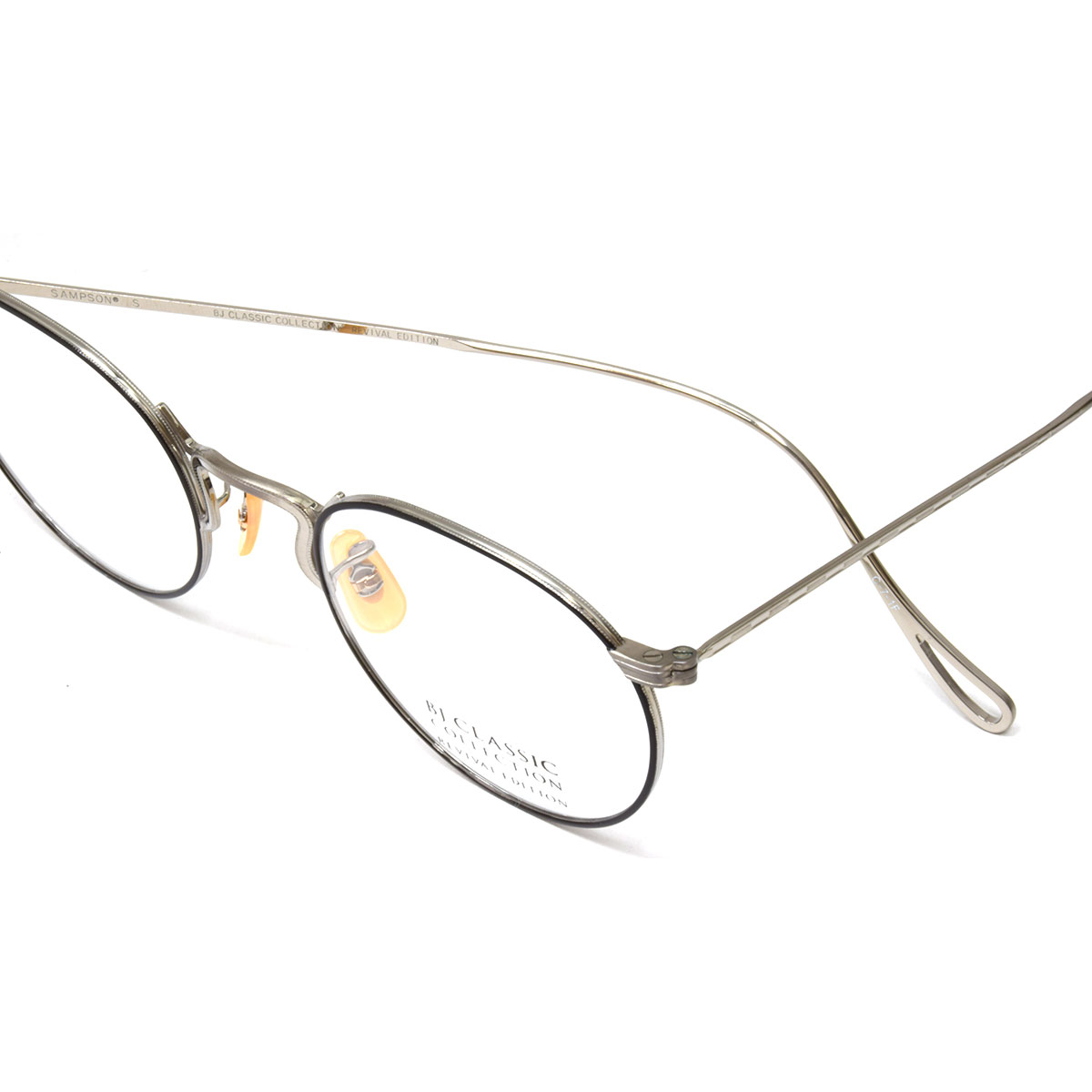 特徴的なブリッジや繊細な彫金が高級感を漂わせ、ツヤをおさえたマットなシルバーとフロントに施された七宝のブラックが上品でスタイリッシュな印象を演出してくれます。こちらは、『SAMPSON® S』のサイズアップモデル。より多くの方に掛けていただきやすいサイズ感です。
