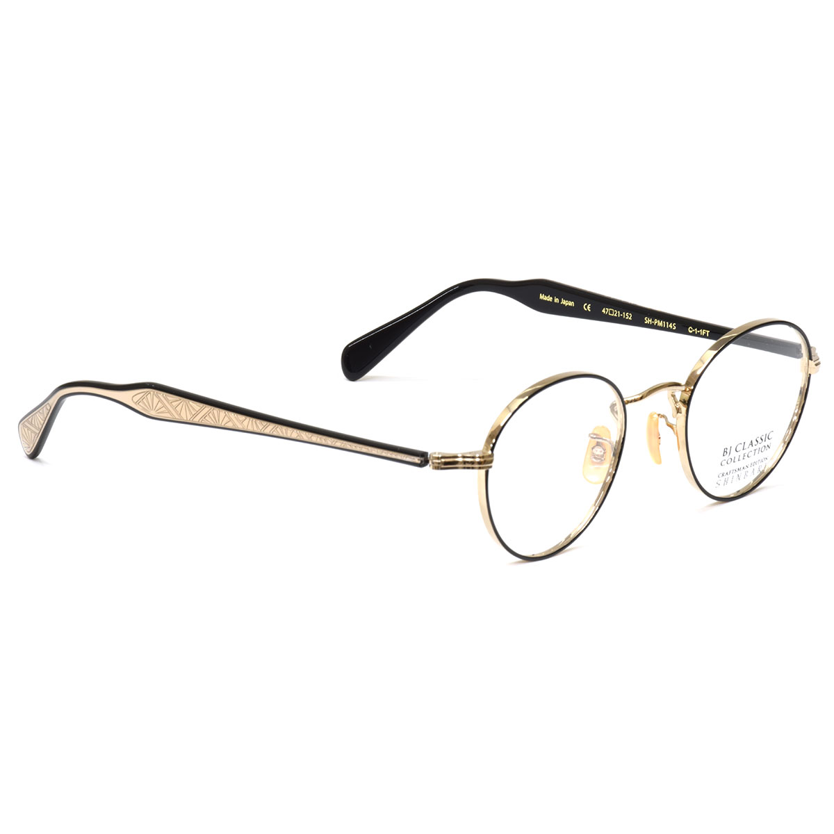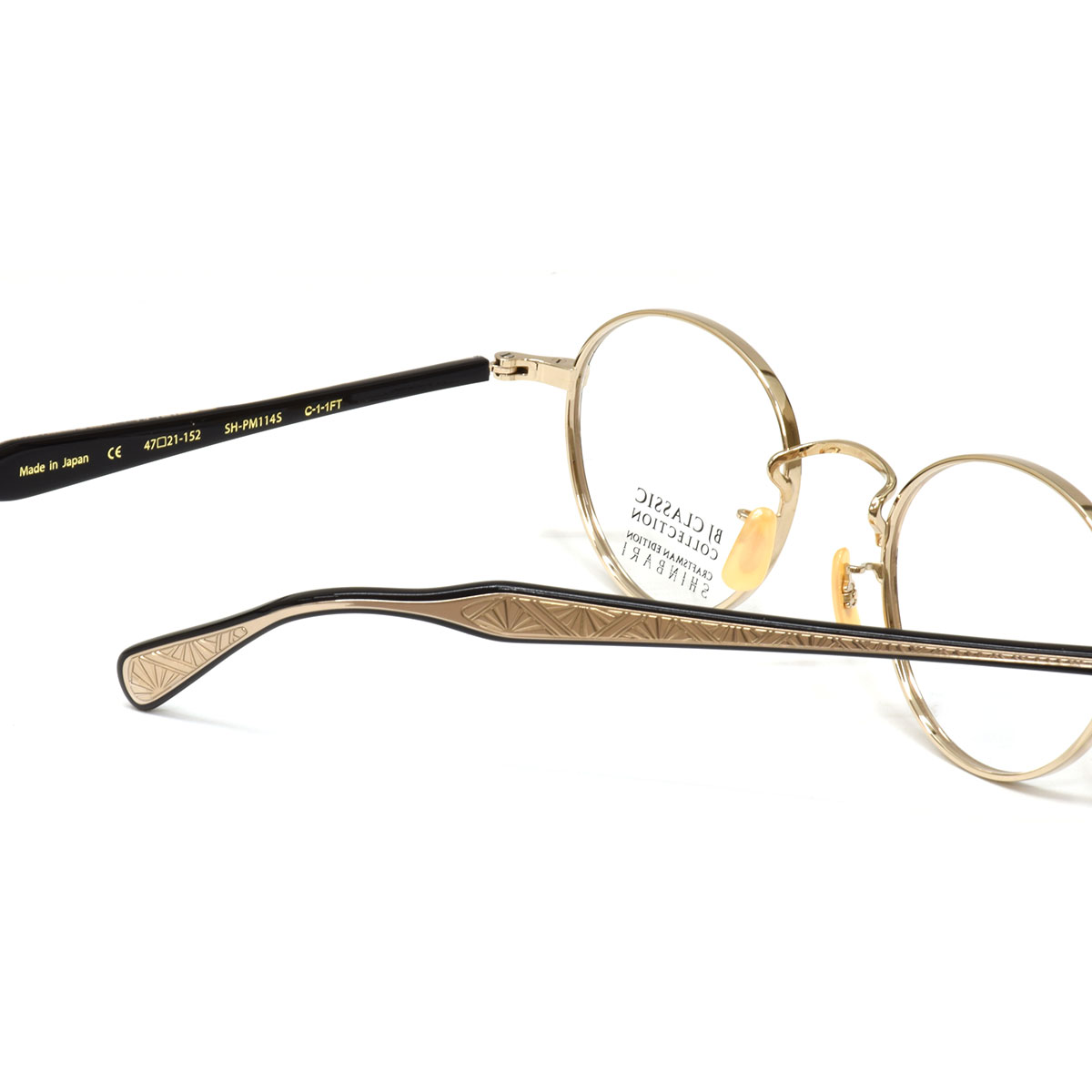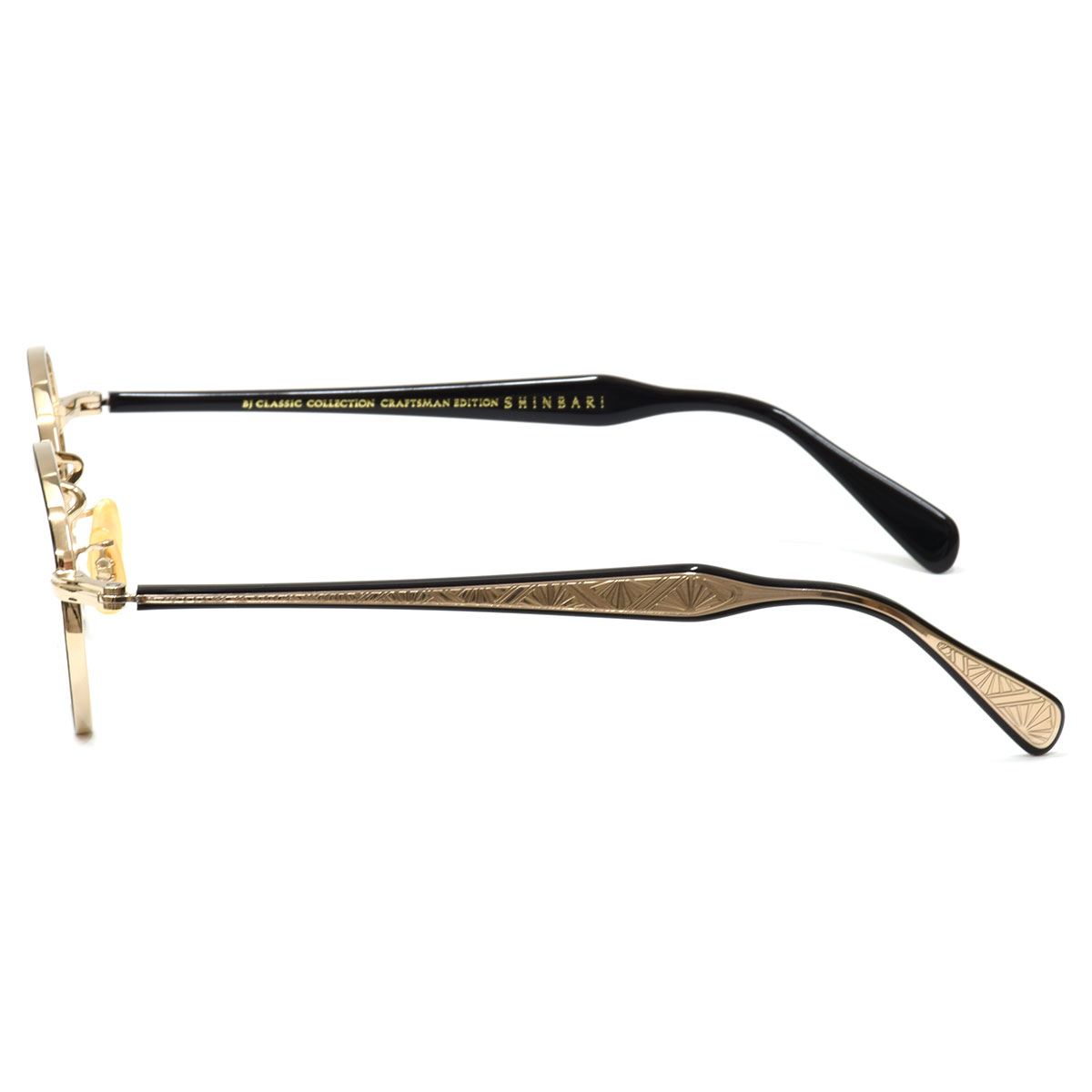伝統技法“芯張り”を用いたSHINBARIシリーズ。テンプル内に仕込まれた芯には繊細な彫金が施されており、外側のクリアカラー越しにその美しい模様が浮かび上がり職人技の緻密さを際立たせます。