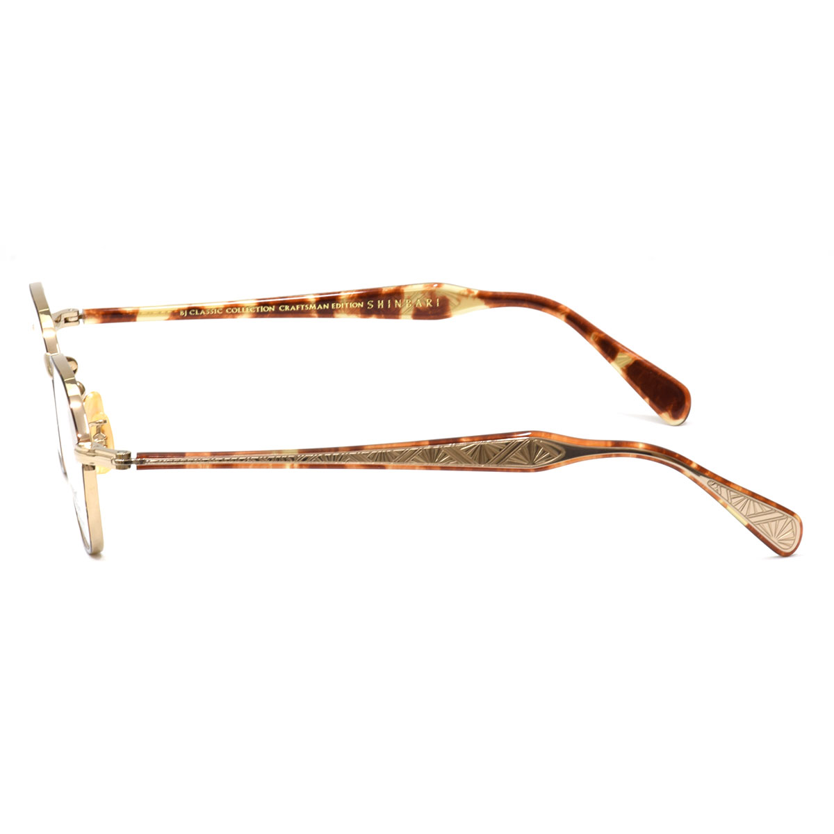 伝統技法“芯張り”を用いたSHINBARIシリーズ。テンプル内に仕込まれた芯には繊細な彫金が施されており、外側のクリアカラー越しにその美しい模様が浮かび上がります。フロントには軽量かつ丈夫なチタンを使用し、シャープな印象と快適な掛け心地を実現。