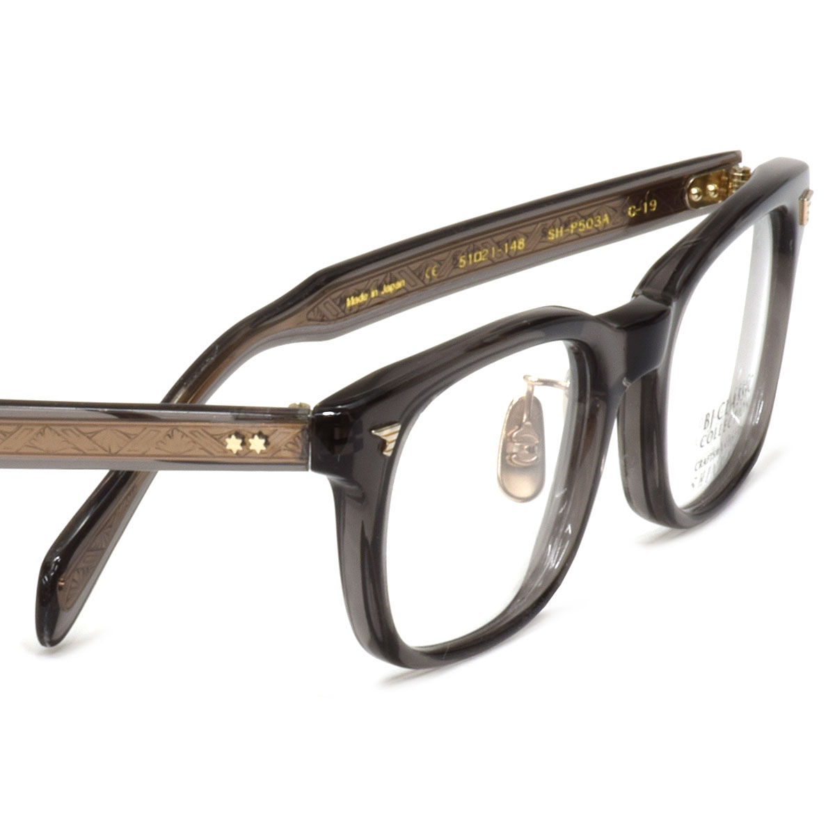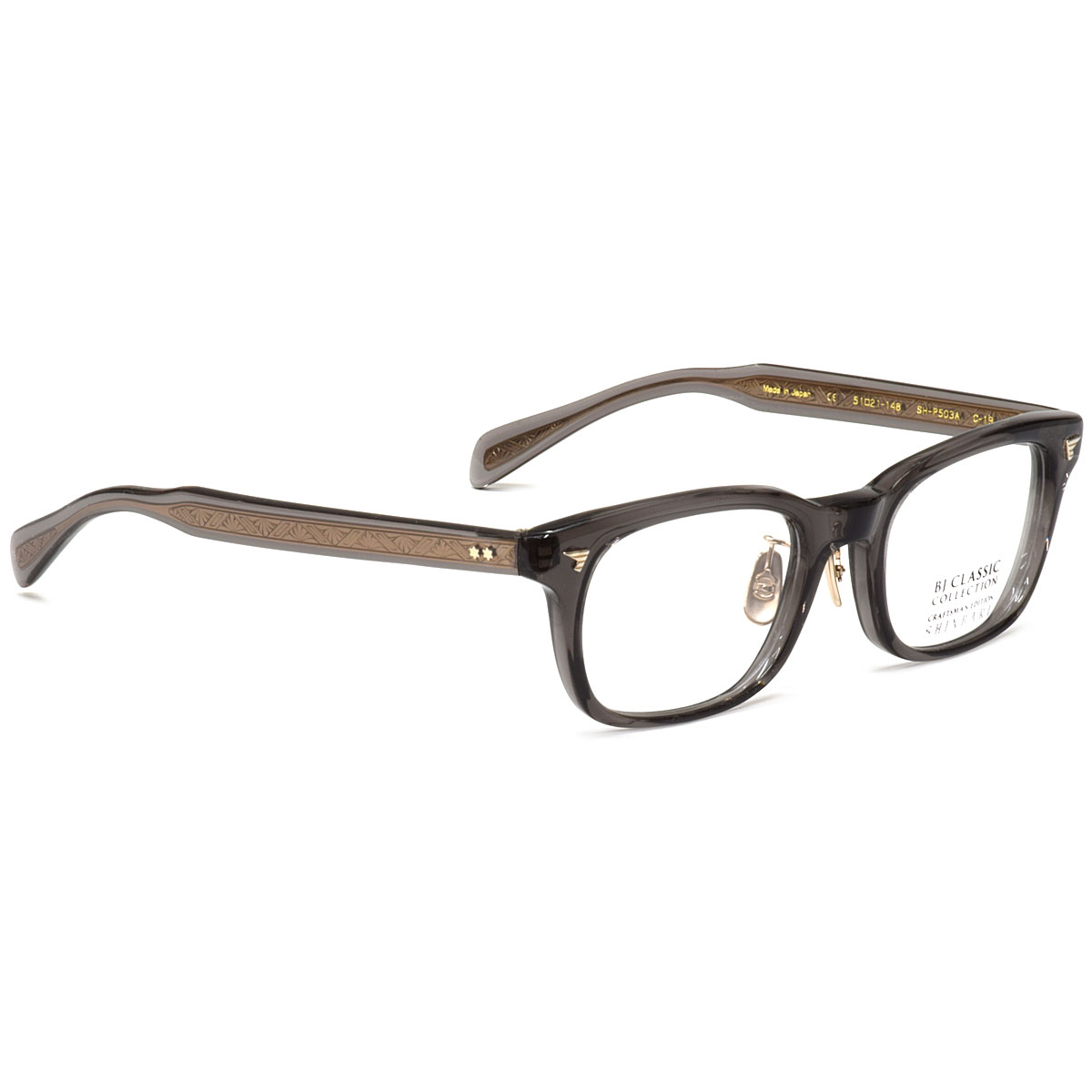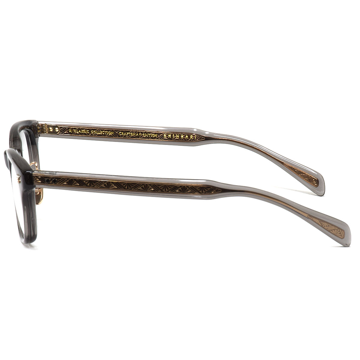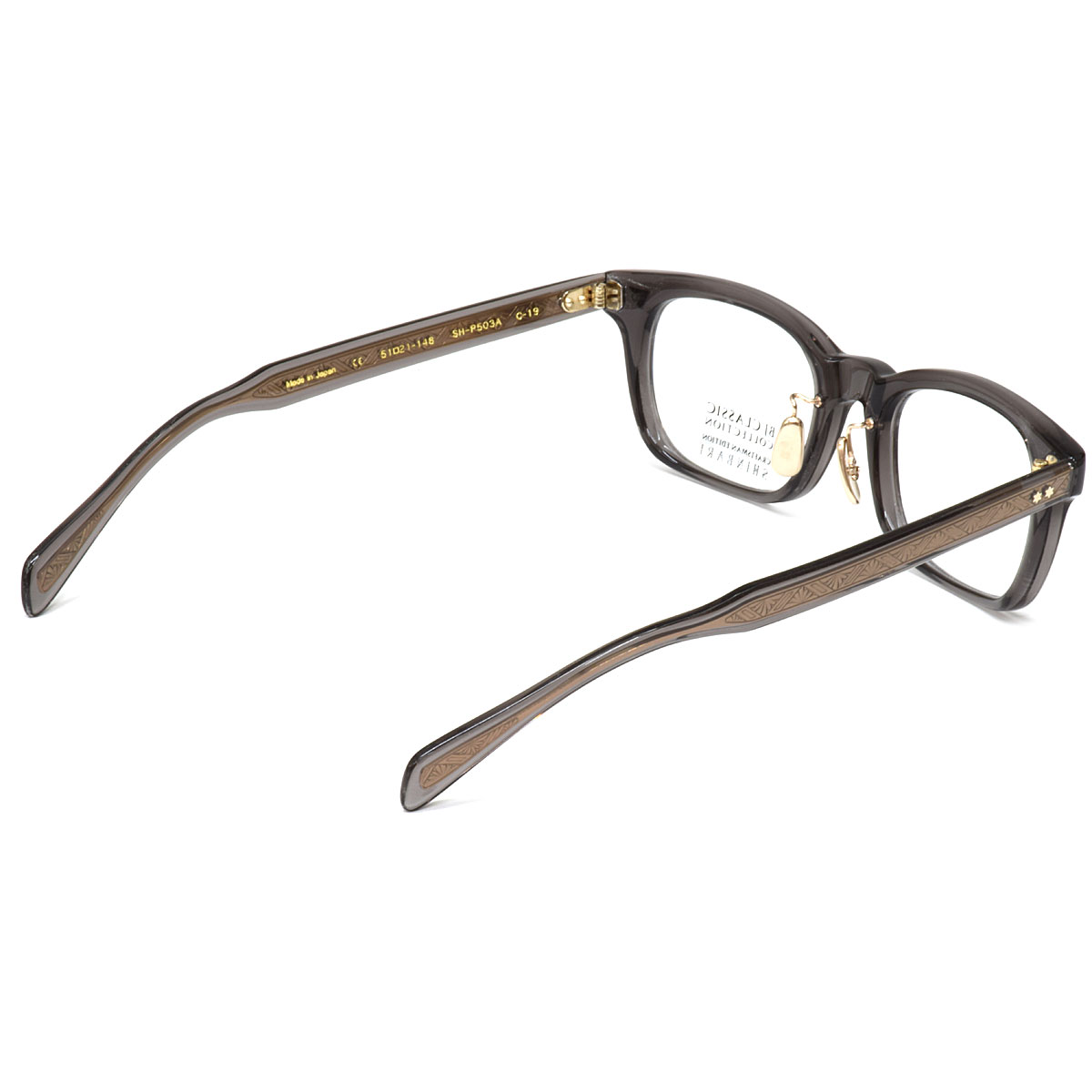 テンプルに繊細な模様の芯材を挟み込む技法【芯張り】を用いて作られた“SHINBARI”シリーズは、セルロイド素材の艶感と高度な技術によって生み出された彫金模様が鮮明に浮かび上がる美しい芯張りのテンプルが一番の魅力です。従来の“SHINBARI”シリーズはレンズ横幅が50mm未満の小ぶりなものが主流でしたが『SHINBARI SH-P503A』はレンズ横幅51mmと、やや大きめサイズでより多くの方にフィットしやすいラインナップになっています。オールプラ素材の“SHINBARI”の中では初めてのクリングス(足付き鼻パッド)付き(チタン)で、掛けやすさにもこだわっています。眼鏡職人の魂のこもった技によって紡ぎ出された造形は、美しく特別な存在感を放つアイウェアです。「SHINBARI」専用の木箱に入れてお届けします。